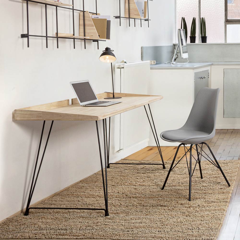 Design-Schreibtisch aus Stahl und Gummibaumholzplatte im Industriestil.