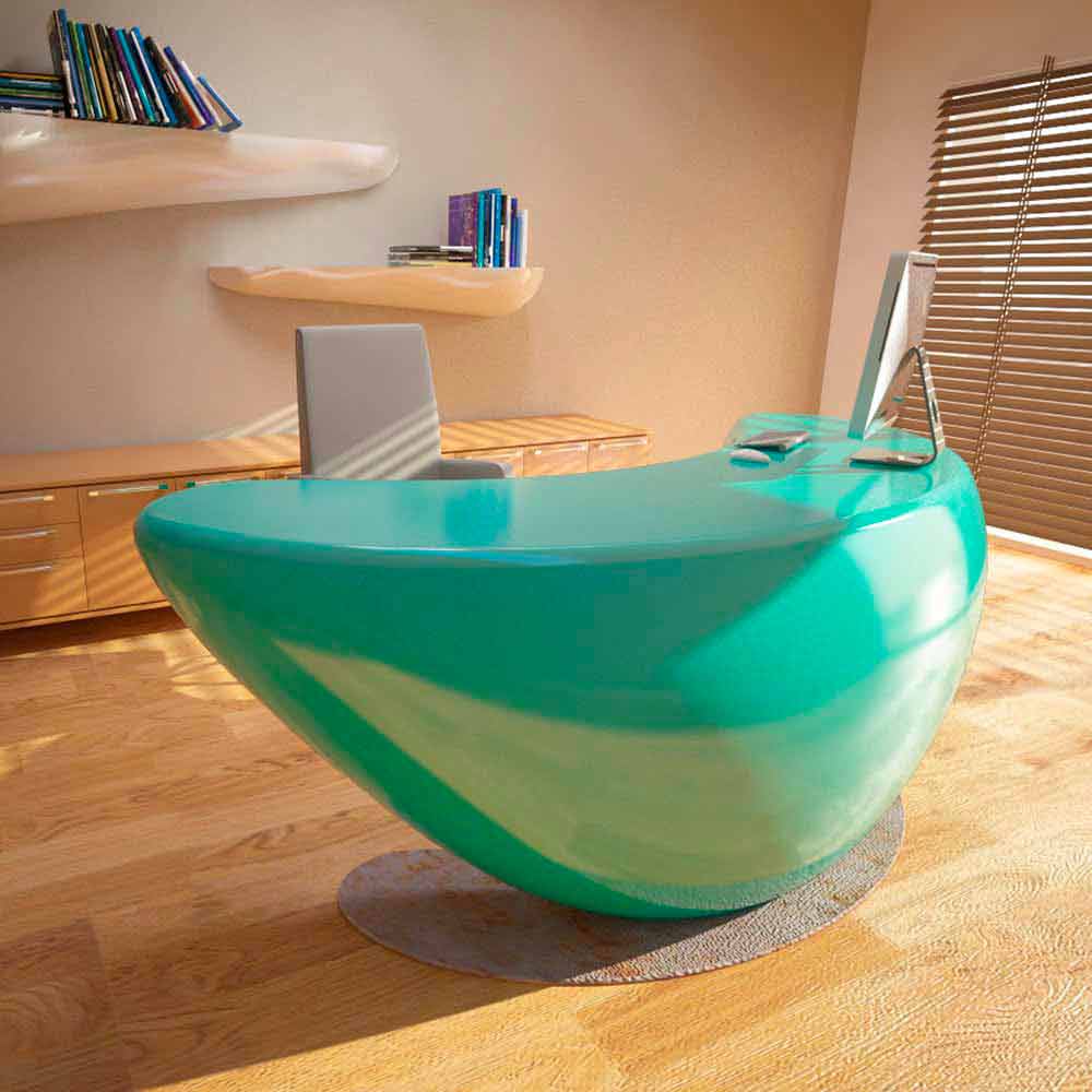 Der Büroschreibtisch Boomerang wird als Design-Ergänzung interpretiert, um die sich die restliche Umgebung einrichten lässt.