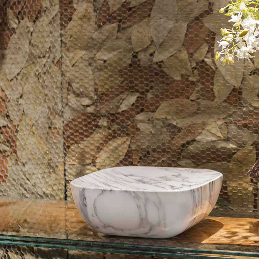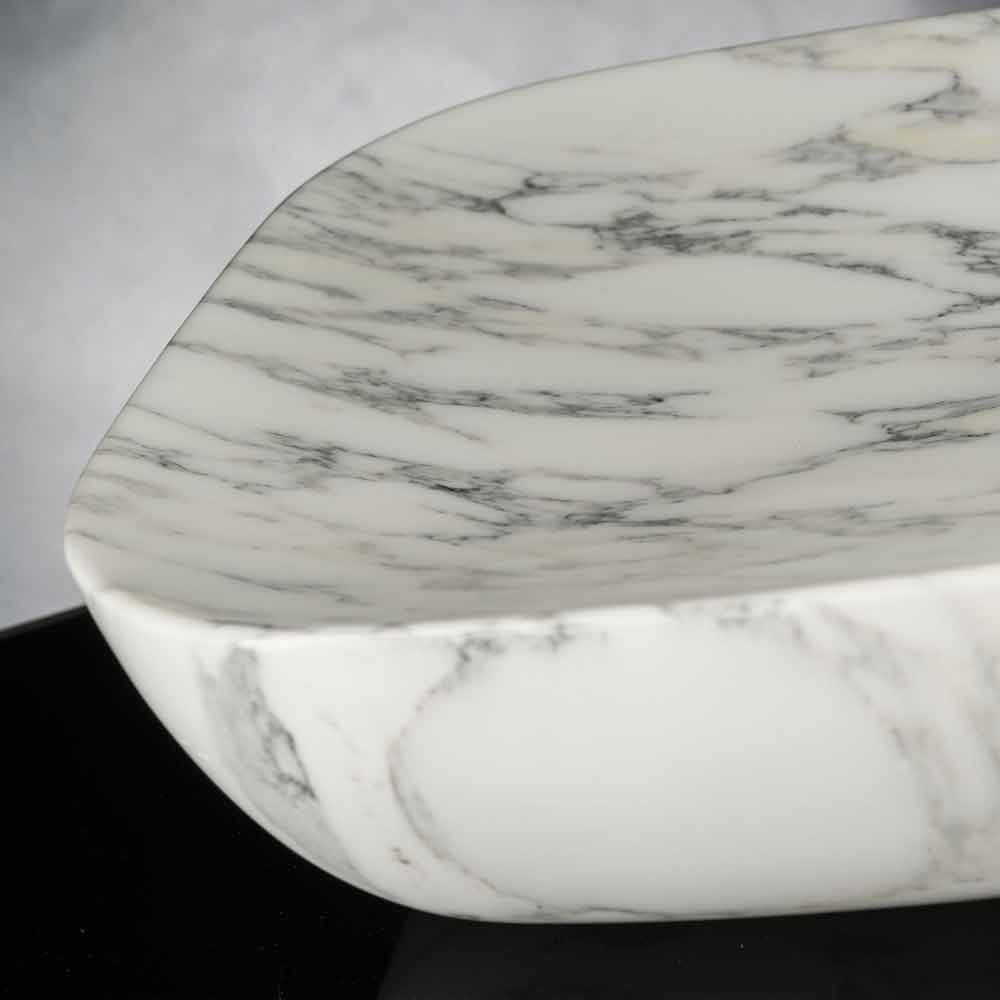 Dekoratives Tablett Made in Italy in weißem Carrrara-Marmor , eine wertvolle Marmorsorte, die durch die Verarbeitung von Natursteinen hergestellt wird, ermöglicht es, komplexere Formen zu erhalten. Ein Objekt von intrinsischer Eleganz, das aus der Begegnung zwischen der Erforschung von Naturphänomenen und der Interaktion verschiedener Materialien mit den vom Menschen verwendeten Technologien entsteht. Das Ergebnis ist ein raffiniertes und vielseitiges Möbelstück, das sich als echtes Tablett, als raffiniertes Mittelstück, aber auch als Taschenleerer am Eingang oder als einfaches Dekorationselement an jedem Ort im Haus einsetzen lässt in der Lage, den Möbeln dank der zeitlosen Eleganz des Marmors und seiner wunderbaren Maserung eine besondere Note zu verleihen.