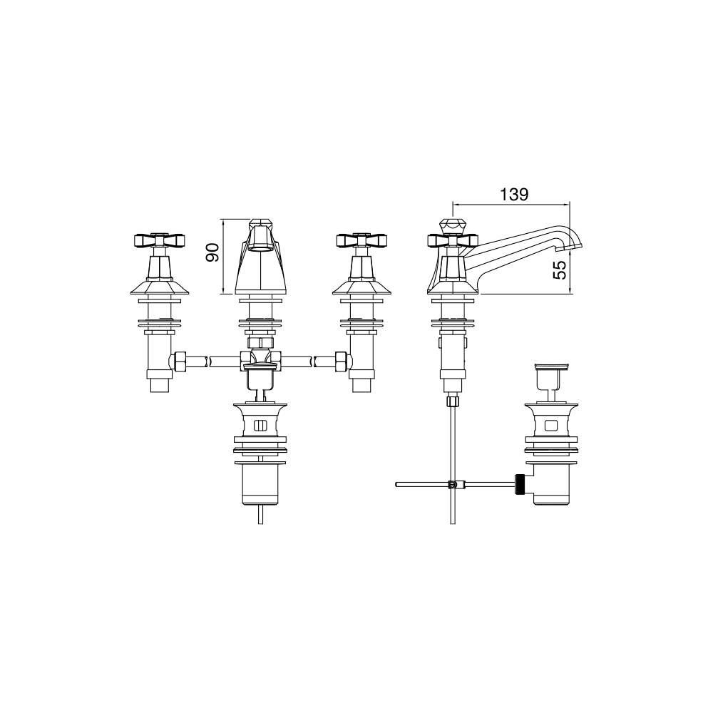Silvana è eine raffinierte und edle Dreiloch-Waschtischarmatur mit Ablauf, aus Messing.