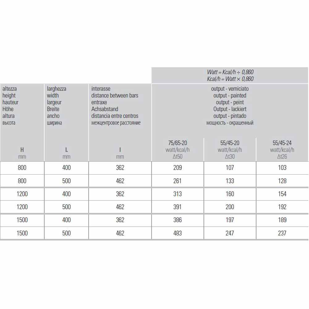 Verfügbare Größen *:- H 800 x L 400 x Inter. 362 mm x Ausgang w (Δt50 *) 209; Ausbeute w (Δt30 *) 107; Ausbeute w (Δt26 *) 103