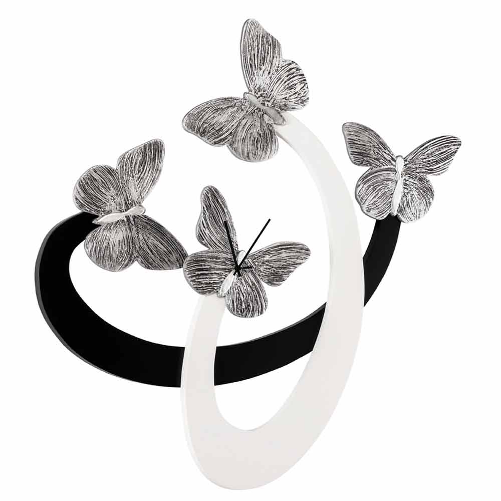 Zenia ist eine elegant geformte Wanduhr, die schwarz und elfenbeinfarben lackiert ist und von Hand mit Silberblatt auf Material verziert wurde.