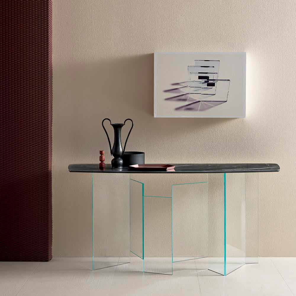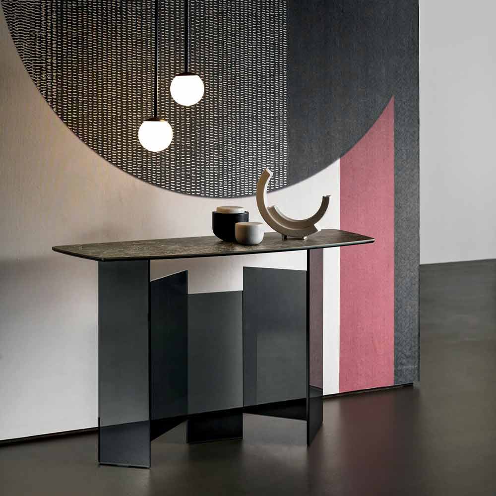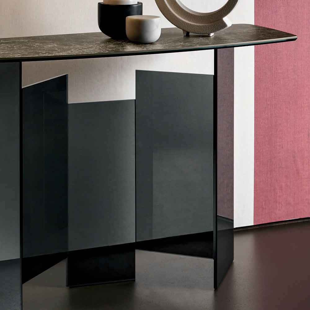 Modernes Wohnzimmer mit Emperador- oder Noir Desir-Keramikplatte und Glassockel, von Hand in Italien realisiert.