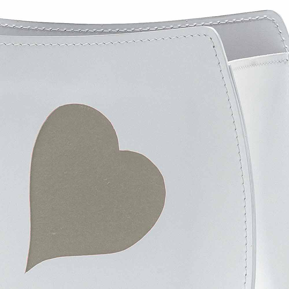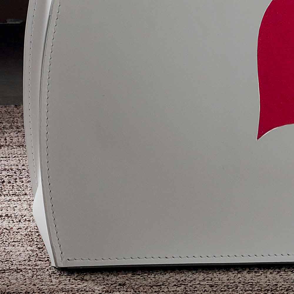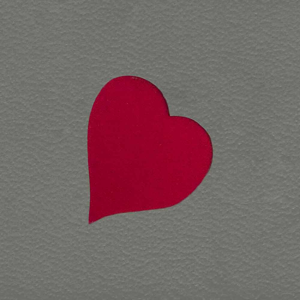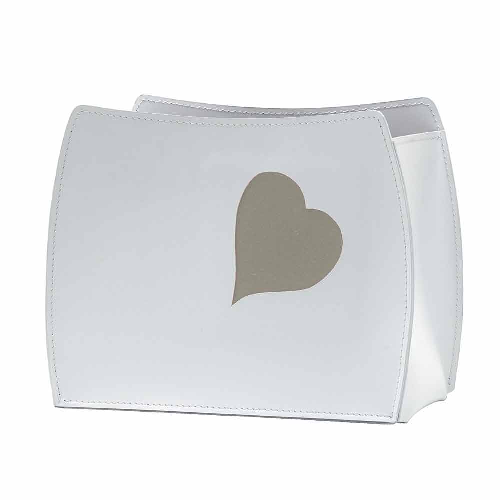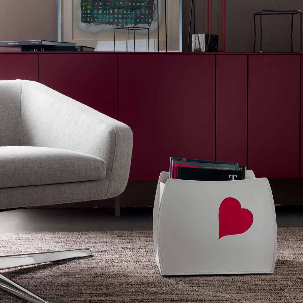 Zeitungsständer aus regeneriertem Leder und herzförmiger Einlage in Rot- oder Taupefarbe. Sie können die Farbe des Zeitschriftenständers und auch die der Herzdekoration wählen.