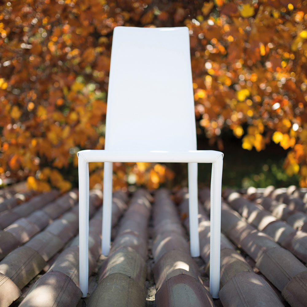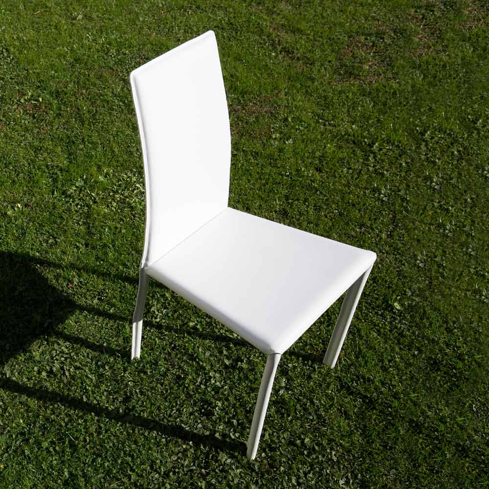 Komplett in Italien hergestellter Esszimmerstuhl, komplett mit weißem Leder bezogen und Struktur mit rundem Bein von ø 22 mm.
