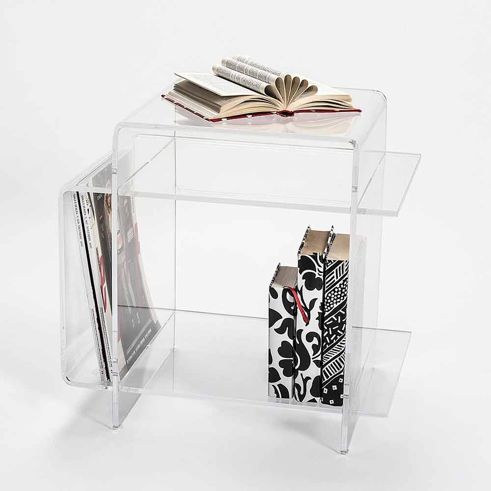 Designtisch aus transparentem Plexiglas in Italien, Gosto Vielseitiger Beistelltisch / Nachttisch mit 3 Fächern, inspiriert von der Geometrie der 1970er Jahre, aus transparentem Plexiglas aus 100% reinen Polymeren, lasergeschnitten und bei hohen Temperaturen gefaltet.