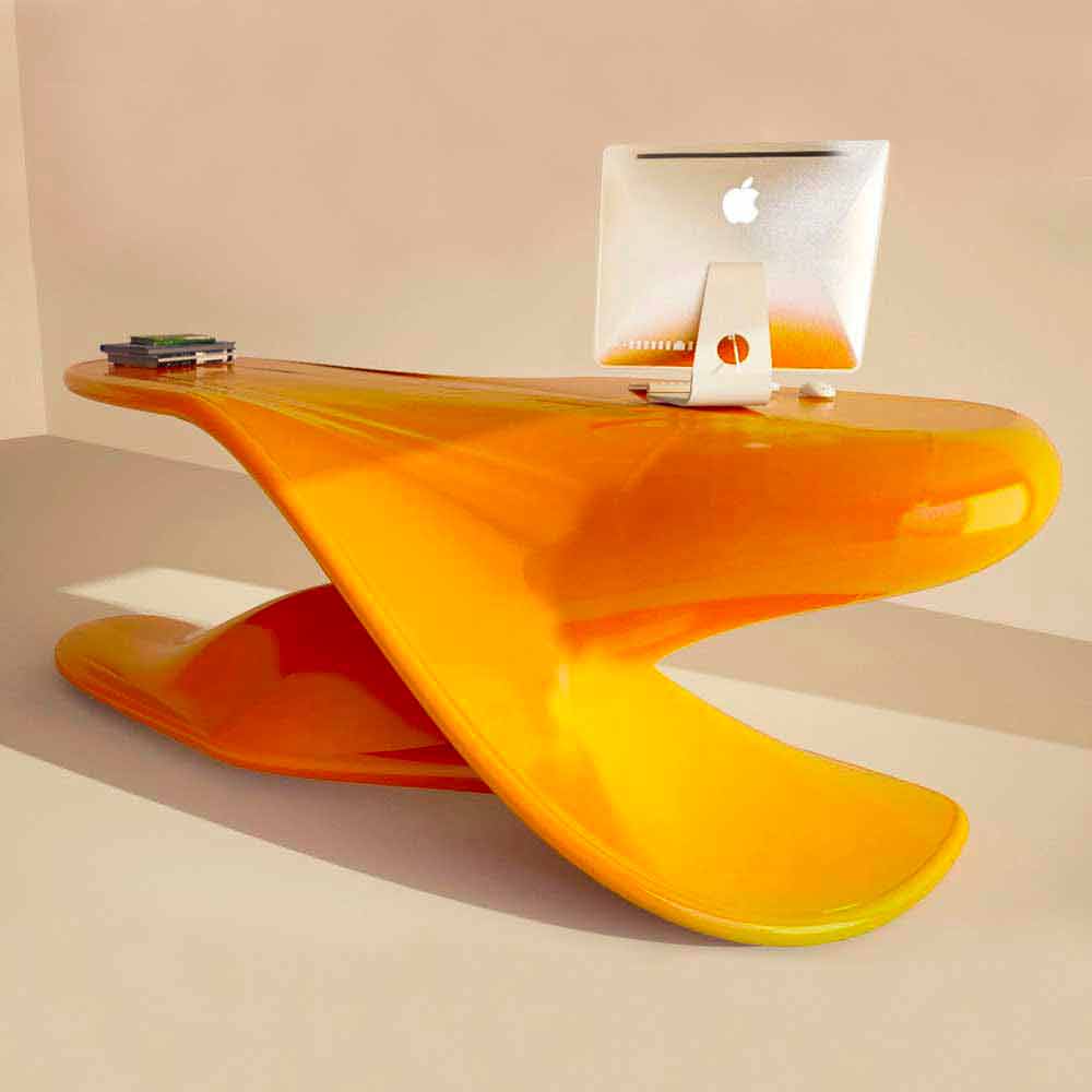 Das Thema des Archer-Büroschreibtisches wird als Materie im Raum interpretiert, was eine gewisse Dynamik im Büroraum suggeriert.