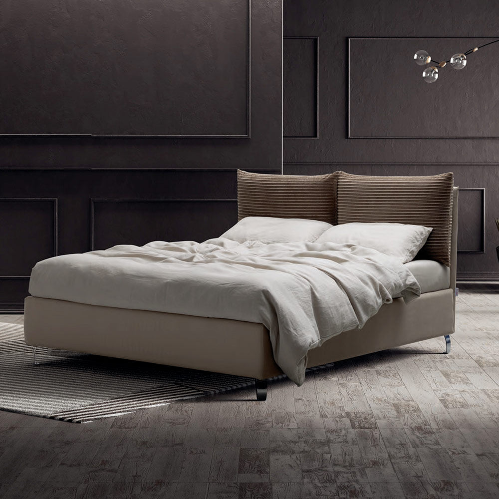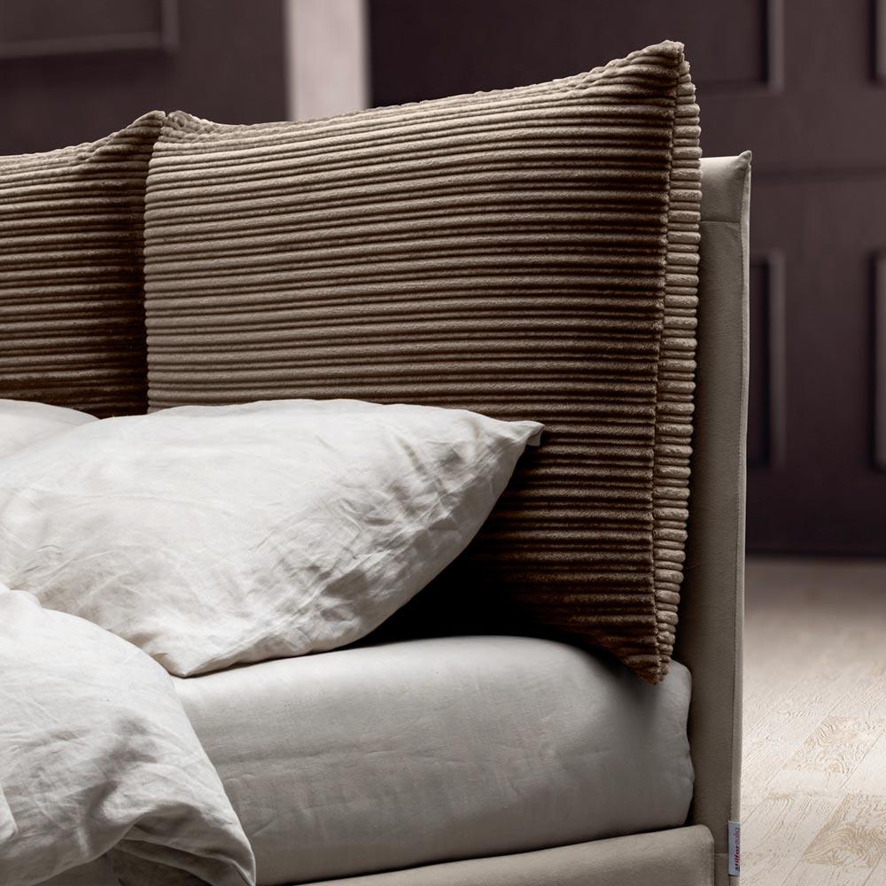 Aufbewahrungsbox, Metallfüßen mit poliertem Stahlfinish (Höhe 12 cm) und Kopfteil mit zwei weichen Kissen aus umweltfreundlichem und grünem Stoff, im Kontrast zum Bett aus wasserabweisendem Stoff. Die Kissen sind mit praktischen selbstklebenden Klettverschlüssen am Rahmen befestigt, die ein bequemes und einfaches Abnehmen ermöglichen.