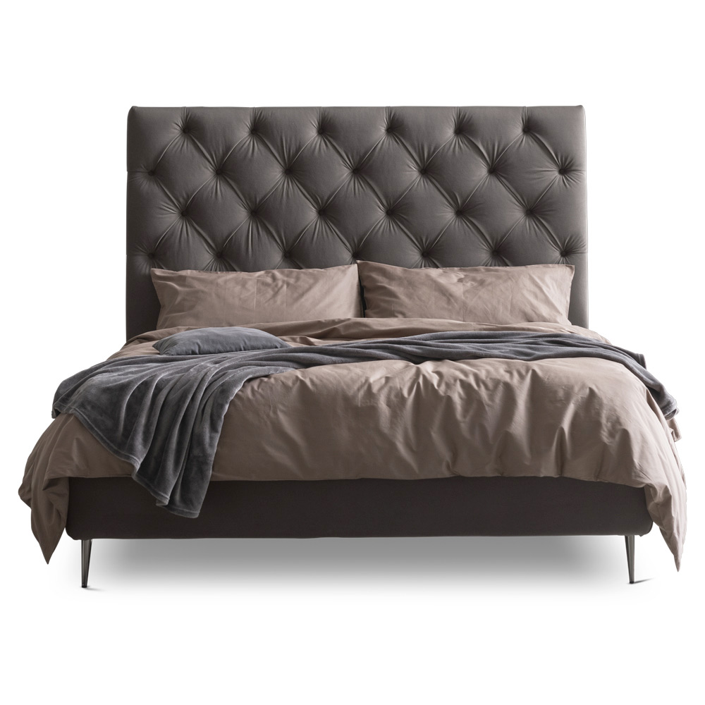 Bettkasten, Metallfüßen in der Farbe Mokka (Höhe 15 cm), gekennzeichnet durch eine wertvolle Steppverarbeitung im Kopfteil aus feuerfestem Stoff und seine beachtliche Höhe, die es einzigartig und elegant machen.