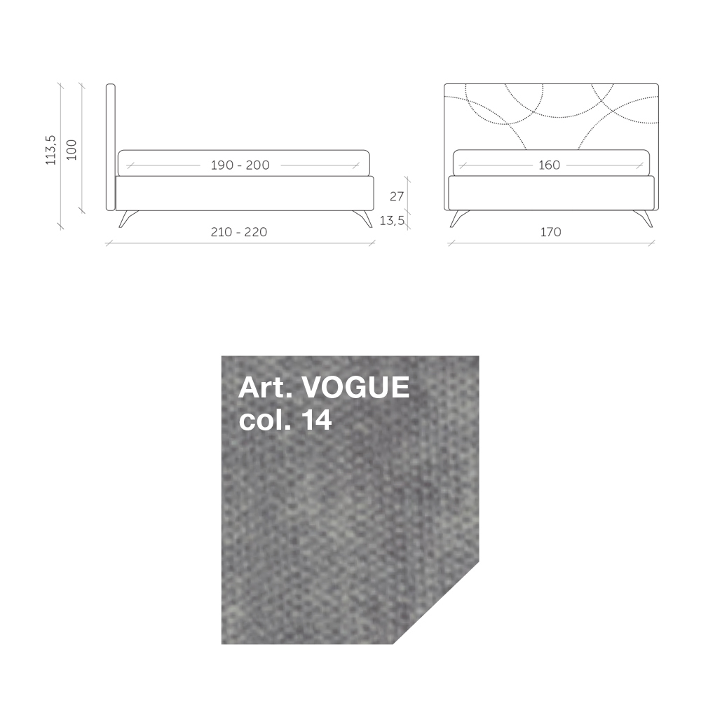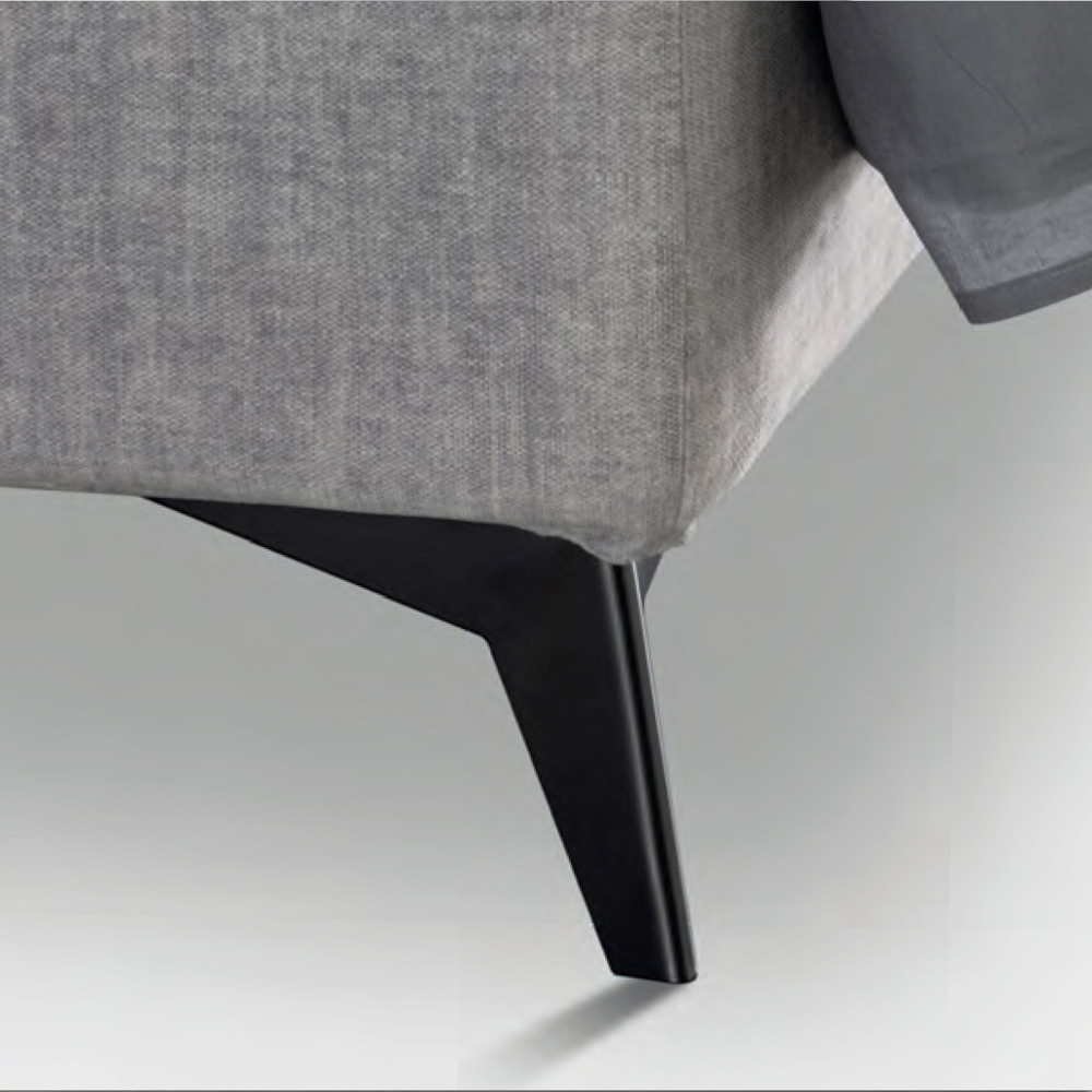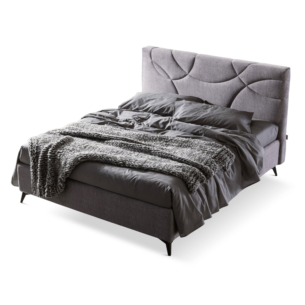 Bettkasten, Metallfüßen in Anthrazitoptik (Höhe 13,5 cm) und dickem Kopfteil aus feuerfestem Stoff, hergestellt mit einem besonderen Steppverfahren aus gekreuzten Kurven, das seine Weichheit hervorhebt und ihm eine starke Persönlichkeit verleiht.