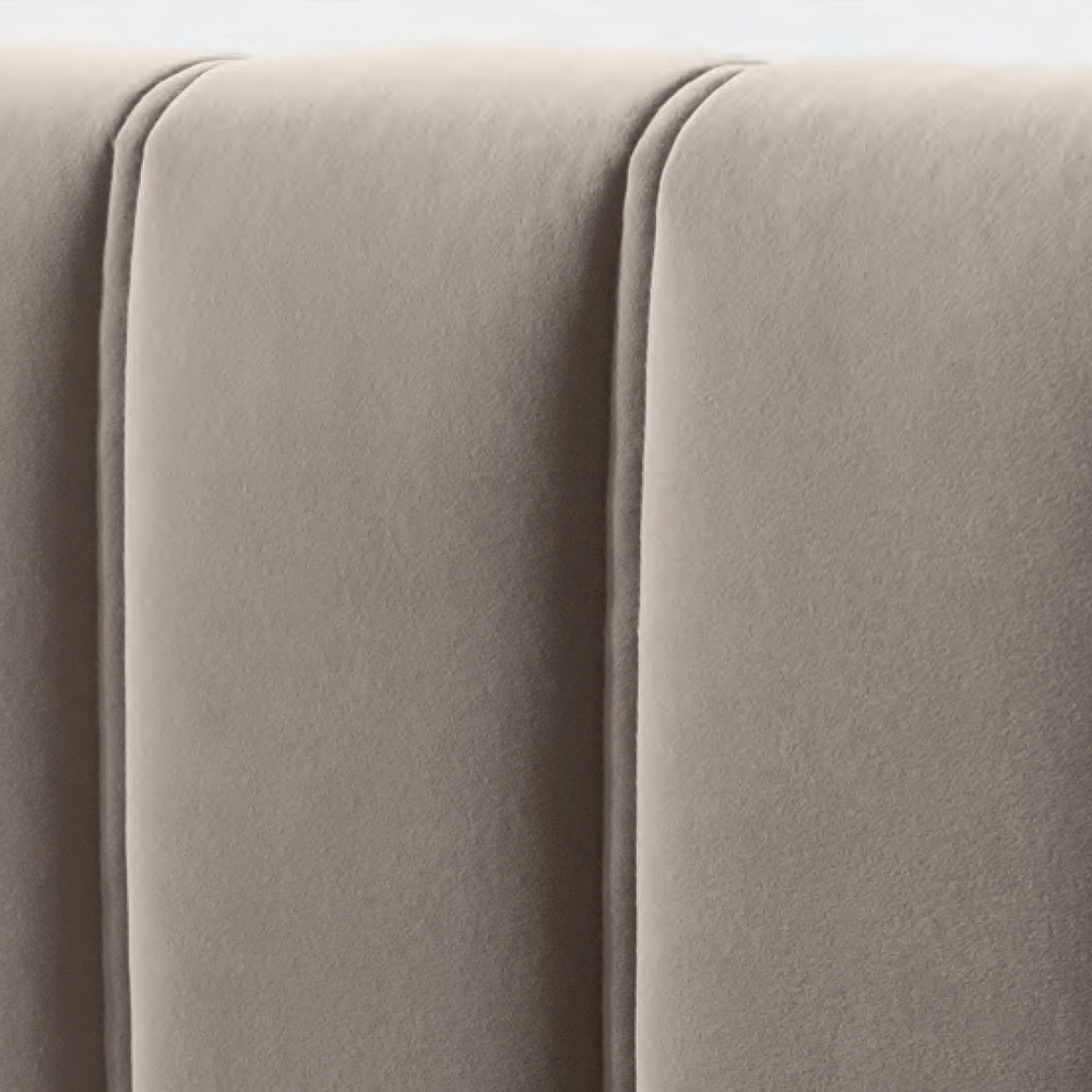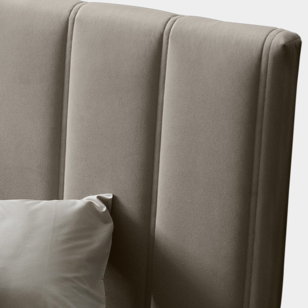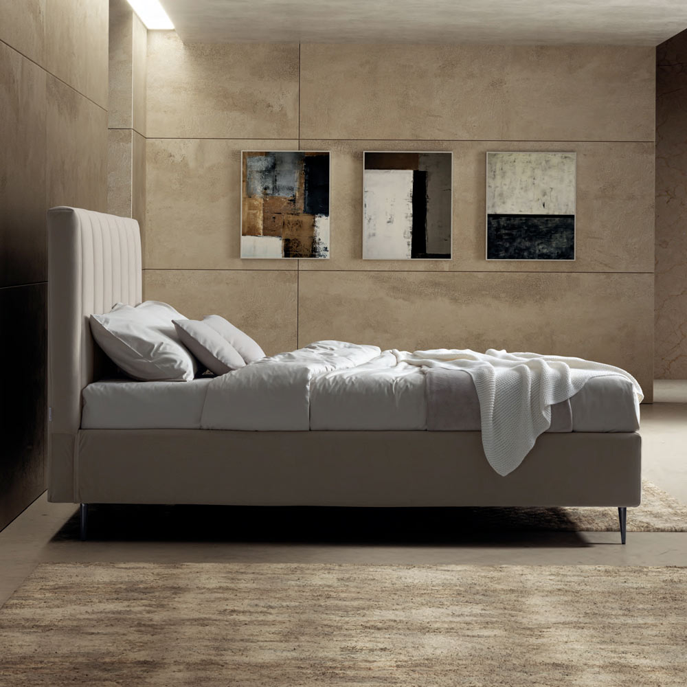 Stauraumbox, Metallfüßen in Mokka-Finish (Höhe 15 cm) und dickem Kopfteil aus feuerfestem Stoff, hergestellt mit einem speziellen Steppverfahren mit breiten vertikalen Bändern, das die Strenge und die klaren Linien hervorhebt.