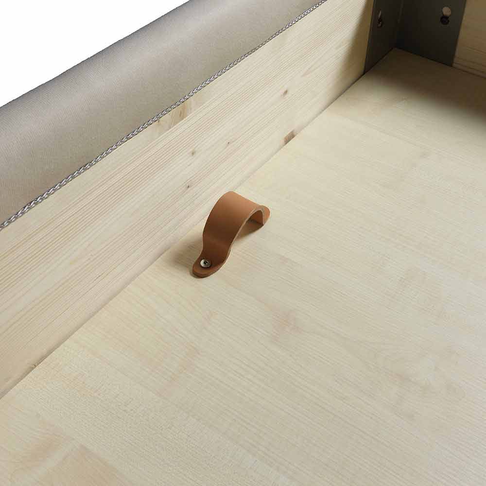 Struktur aus Tannenholzstreifen mit natürlicher Innenbeschichtung, H. 29 cm, mit Polyurethanschaum ohne Fluorchlorkohlenwasserstoffe gemäß UNI-Normen überzogen und mit lichtbeständigem Velfodera ausgekleidet. Die Böden der Struktur bestehen aus Holzagglomerat mit synthetischer Innenbeschichtung in Tannenoptik, letztere werden durch PE- und Rohrprofile gestützt. Lattenrost mit Metallstruktur, gebogener Rahmen mit 50 x 37 mm großem Profil, lackiert mit Epoxidpulver. Normaler orthopädischer Lattenrost, gebogene Latten aus Buchensperrholz.