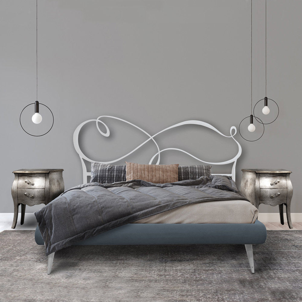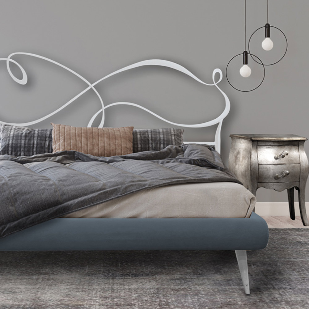Dieses Bett entstand aus dem Wunsch, eine leichte und schwebende Atmosphäre im Schlafzimmer zu schaffen. Die Linien erzeugen einen Hauch von Wind, der die Struktur aufhellt und sie perfekt zur Vervollständigung der Einrichtung jedes Schlafbereichs macht, ohne auf Funktionalität und Komfort zu verzichten.