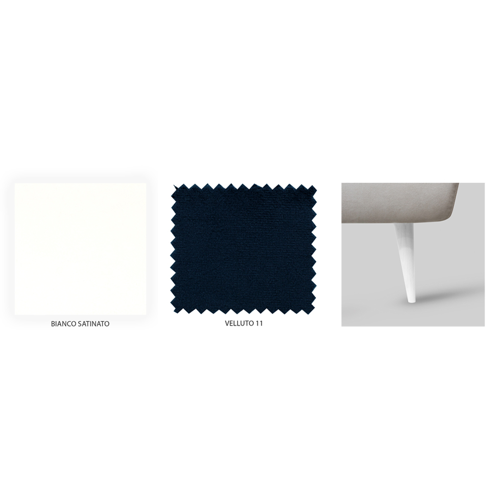 - Modell H 25 Fuß: Kopfteil in Satinweiß, Bettrahmen in grau/blauem 11-Fuß-Samt und weiße Holzfüße