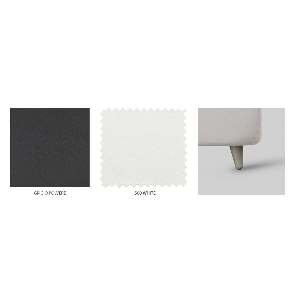 Verfügbare Ausführungen:- Modell H 11 Fuß: pudergraues Kopfteil, weißer Bettrahmen aus Ökoleder und taubengraue Füße aus Polypropylen