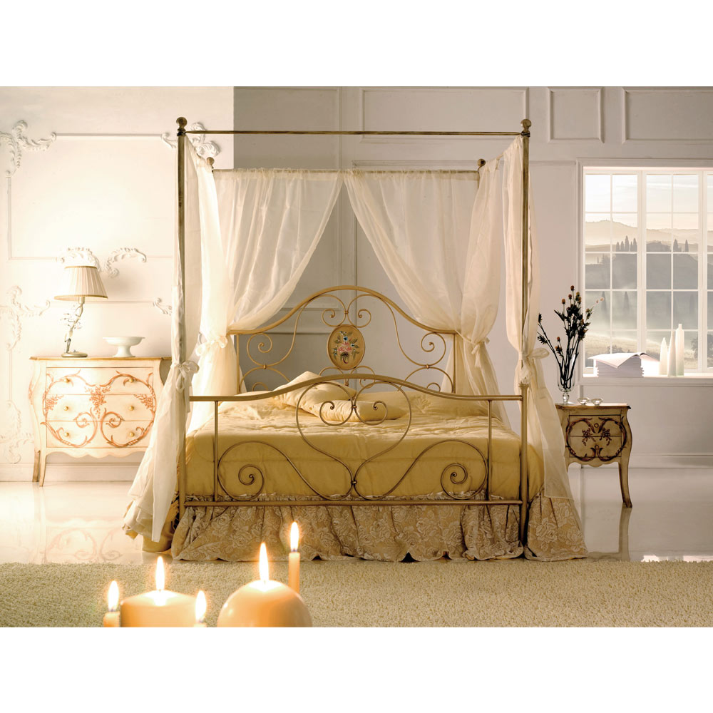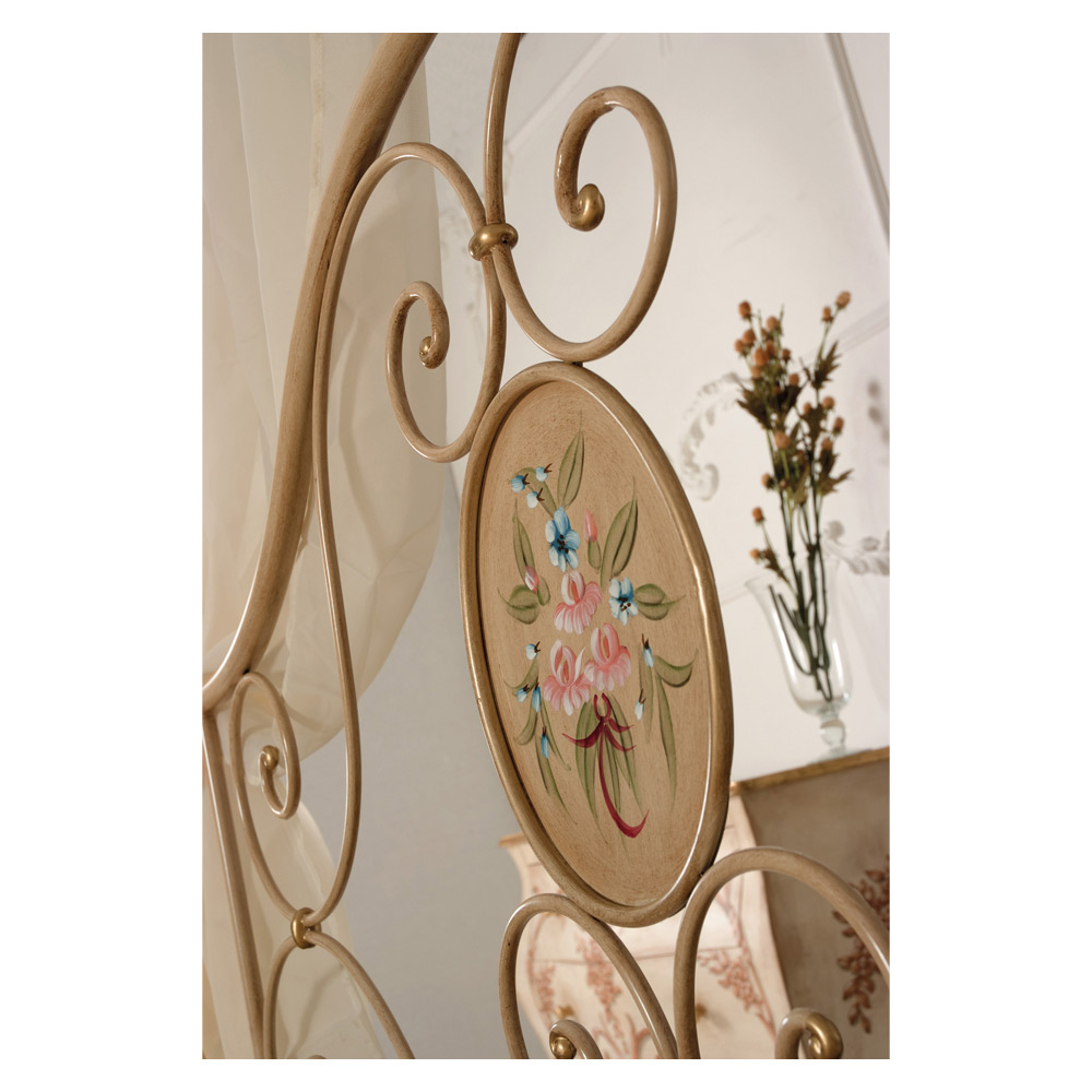 Eisenrohr mit Pulverbeschichtung in antikem Elfenbein. Dieses Bett ist eine charaktervolle Wahl mit ausgesprochen klassischem Flair, die unvergleichliche Weichheit und Raffinesse bietet. Das florale Detail am Kopfteil wird mit großer Sorgfalt und Aufmerksamkeit handgefertigt, um dem Produkt eine einzigartige und unwiederholbare Note zu verleihen.