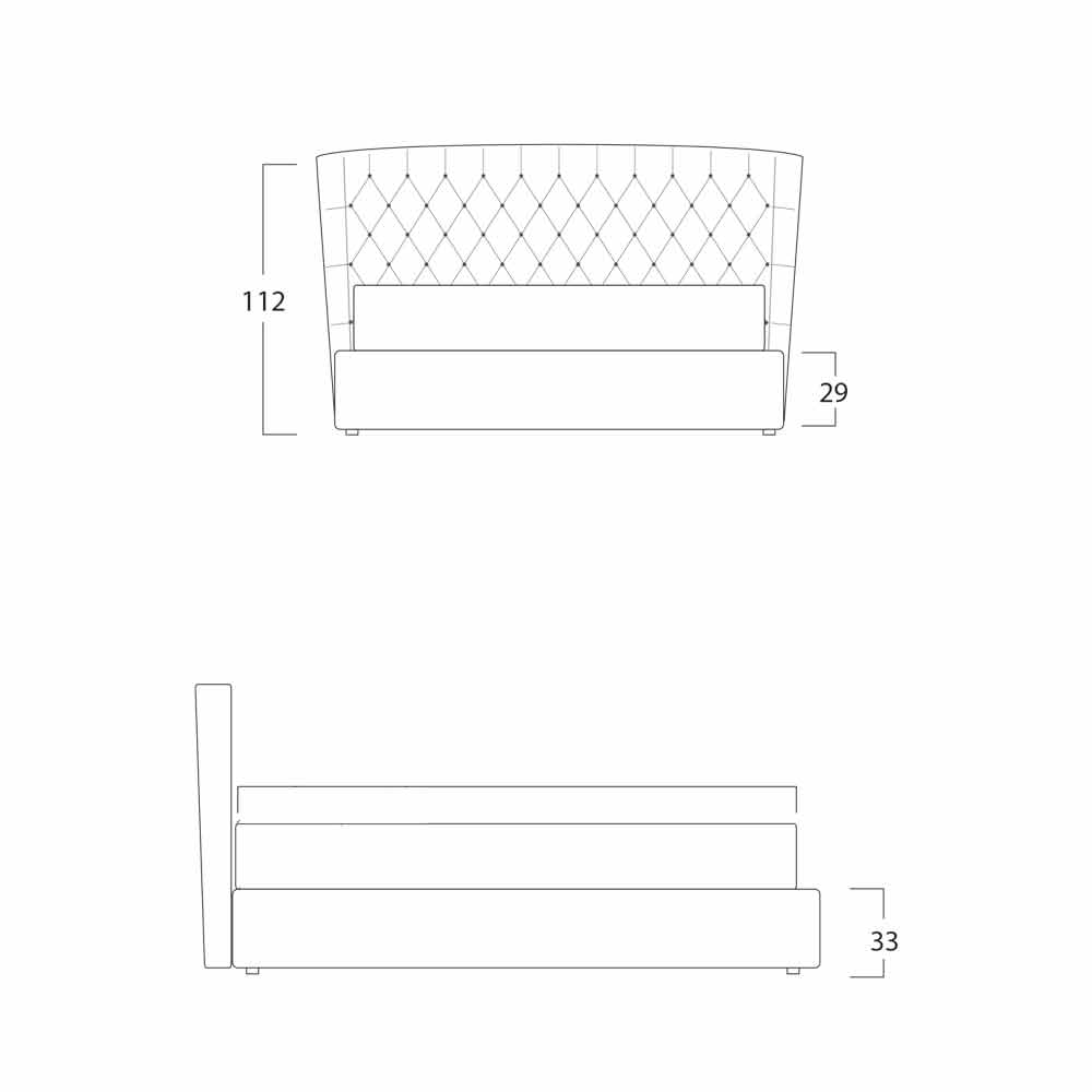 Die Struktur besteht aus Tannenholzleisten mit natürlicher Innenoberfläche H 29 cm und ist mit Polyurethanschaum ohne Fluorchlorkohlenwasserstoffe gemäß UNI-Normen überzogen und mit lichtbeständigem Velfodera ausgekleidet. Das Bett wird mit einem Lattenrost mit Metallstruktur geliefert, gebogener Rahmen mit 50x37 mm Profil, lackiert mit Epoxidpulver. Normaler orthopädischer Lattenrost, 15 Latten aus gebogenem Buchensperrholz 68x8 mm pro Bett.
