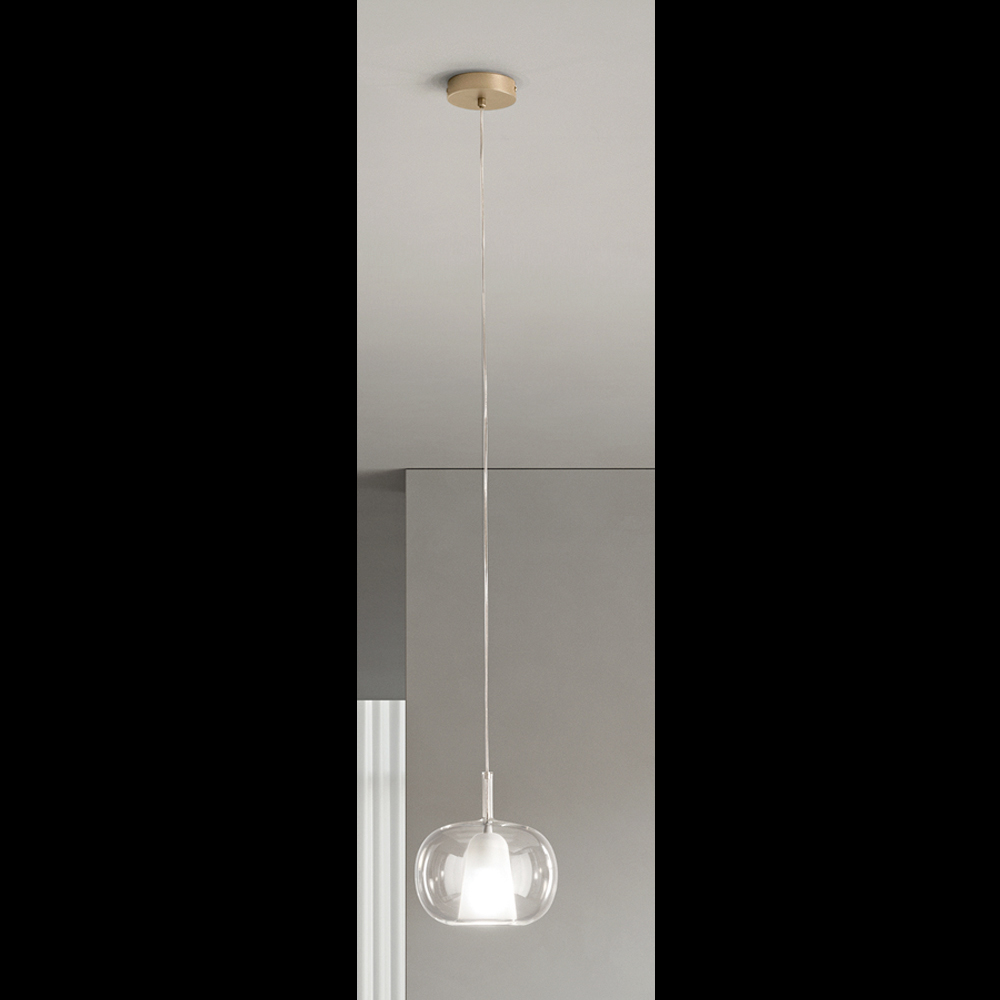 Lampe mit Metall -Deckensockel und Diffusor aus geblasenem Glas , gekennzeichnet durch eine Doppelschicht: innen aus satiniertem Glas und außen aus farbigem Glas . Kappe aus Polymermaterial zur Stabilisierung des Kabels in einer zentralen Position. Verstellbares Kabel.