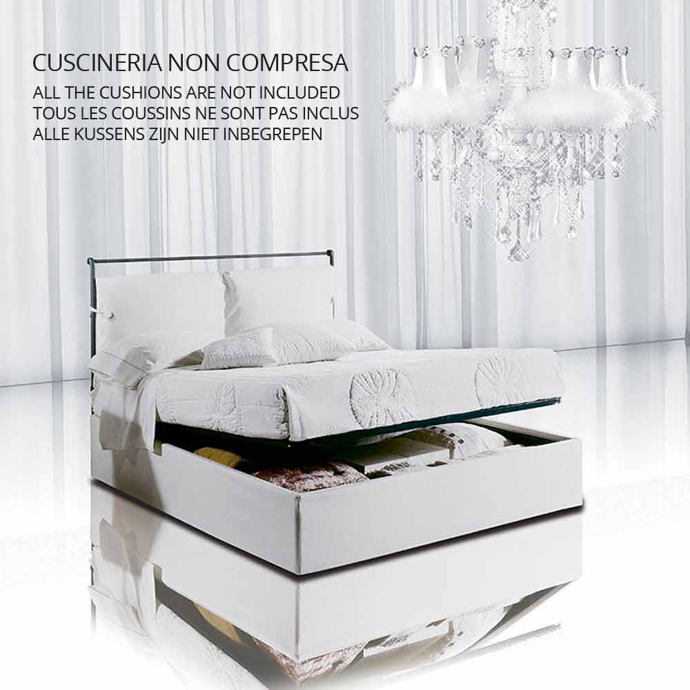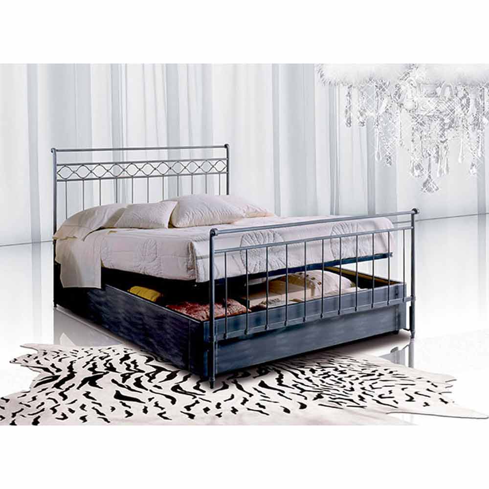 Das schmiedeeiserne Bett in der Variante DOPPELTES KOPFTEIL MIT FUSSTEIL UND CONTAINER verfügt über einen Lattenrost, der eine Matratze von 160 x 190 cm aufnehmen kann. Der von uns gelieferte Lattenrost verfügt über ein spezielles Matratzenhaltesystem, das es ermöglicht, auch eine Matratze von 190 cm Länge aufzunehmen. Bei besonderen ästhetischen Anforderungen kann dieses Modell dank unserer handwerklichen Produktivität in der Höhe verändert werden. Der Container ist vollständig aus Metall gefertigt und kann in jeder Farbe lackiert werden. Ein Metallcontainer garantiert unserem Bett unzählige Vorteile, darunter Robustheit, einfache Reinigung und größere Kapazität. Der Container kann in jedem Fall mit einem Textilvolant kombiniert werden. Diese Version mit Fußteil zum Beispiel kann nur dank der Metallstruktur des Containers hergestellt werden, eine sehr willkommene Kombination, da Sie so den Klassizismus eines kompletten Bettes mit der Bequemlichkeit der Nutzung des Stauraums verbinden können.