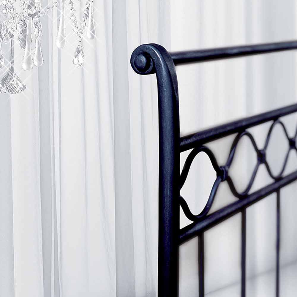 Das schmiedeeiserne Bett in der Variante DOPPELTES KOPFTEIL MIT WANDBEFESTIGUNG erfordert den Einbau eines 160 cm langen Bettgestells, das von eigenen Beinen getragen werden muss. Bei besonderen Anforderungen in Bezug auf die körperliche Konstitution, die Kombination mit vorhandenen Bettgestellen oder einfach aus ästhetischen Gründen kann dieses Modell dank unserer handwerklichen Produktivität in Höhe und Breite verändert werden.