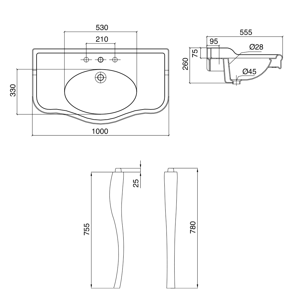 - Aufsatz: B 100 x T 55,5 x H 26 cm mit Einzelbecken; Beine: H 78 cm mit Aufkantung und Aufkantung 1-3 Armaturenlöcher - L 1000 mm;