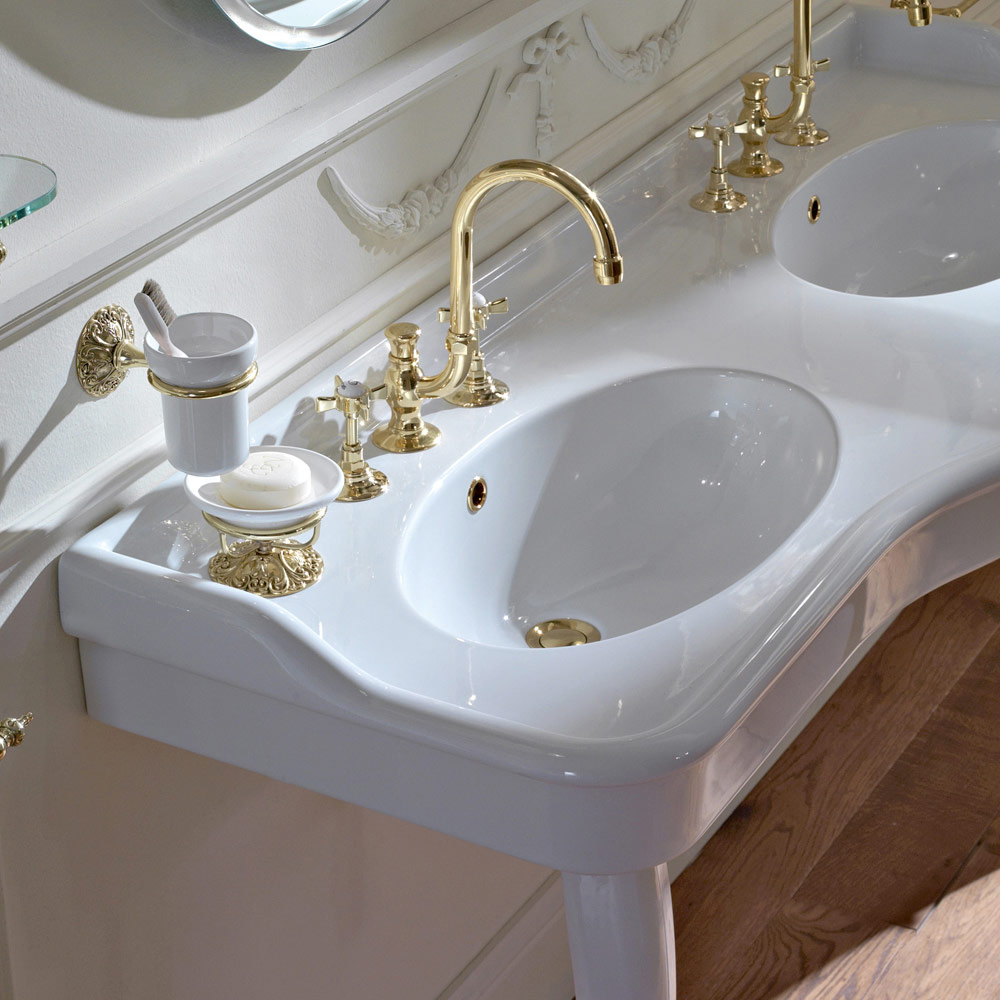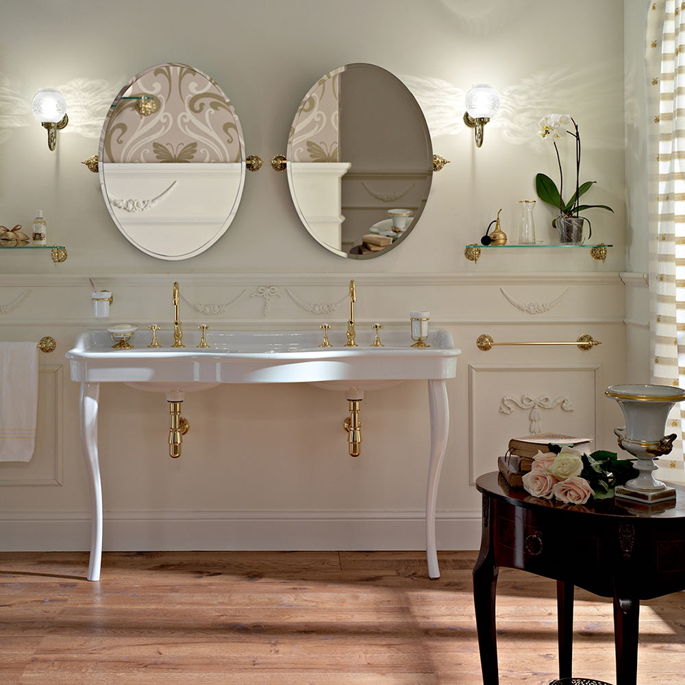 Konsolentisch für das Bad mit Doppelwaschbecken aus weißer Keramik Paulina, hergestellt in Italien.