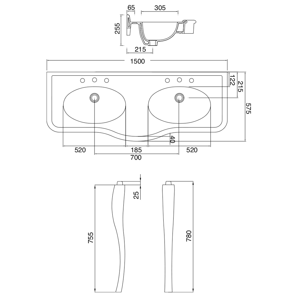 - Aufsatz: L 150 x B 57,5 x H 25,5 cm mit Doppelbecken; Beine: H 78 cm mit Aufkantung 1-3 Hahnlöcher für Becken - L 1500 mm;