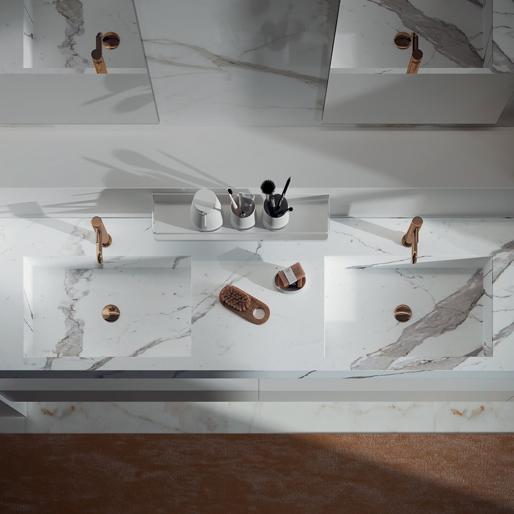 Doppelte Badezimmerkomposition mit doppeltem rechteckigen Glasspiegel , Sockel aus glänzend weißem kratzfestem Melamin mit drei Schubladen mit sanftem Schließmechanismus und HPL -Top mit integriertem doppelten Waschbecken in der Farbe Calacatta .