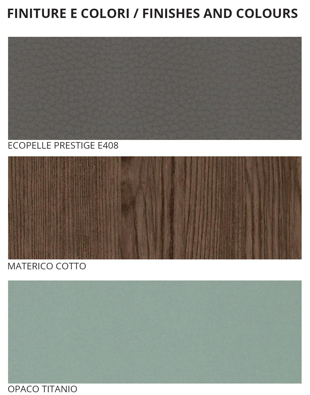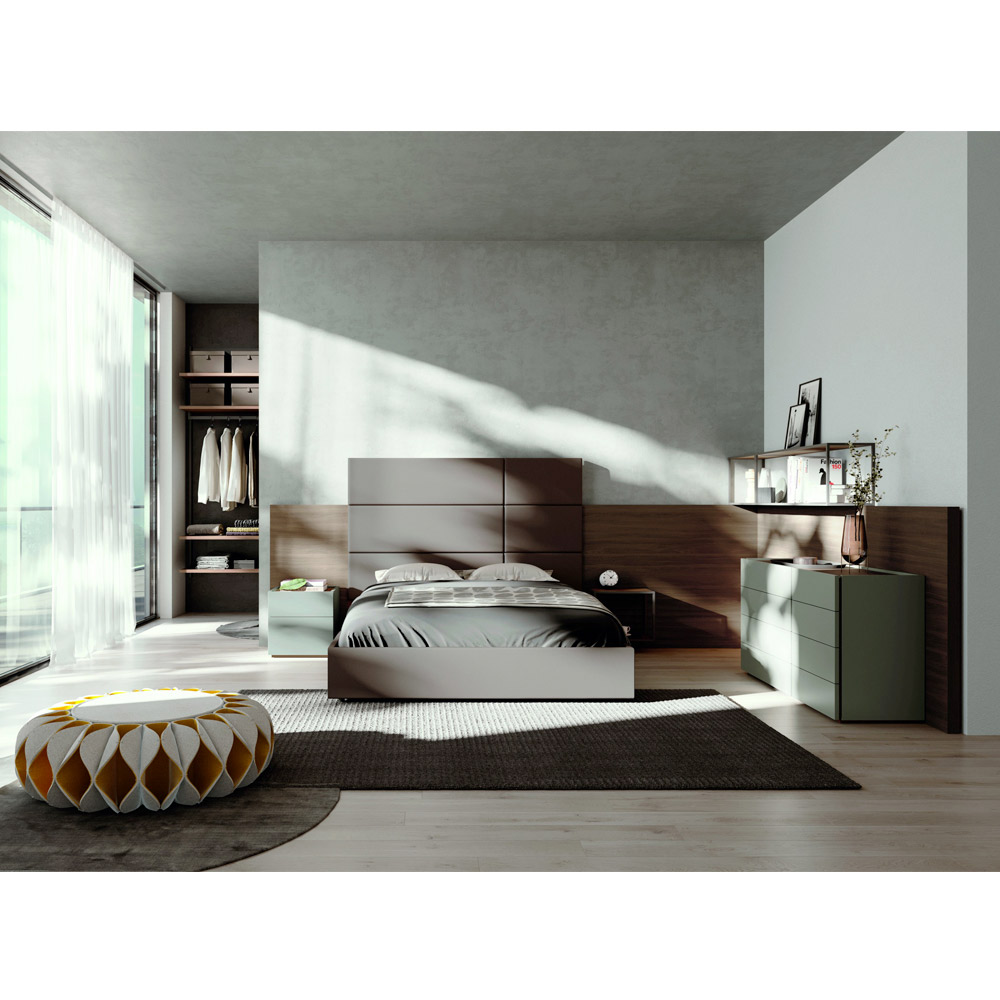 Schlafzimmermöbel bestehend aus 5 Elementen, vollständig in Italien hergestellt . Die Komposition umfasst ein Doppelbett mit gepolstertem Bettrahmen aus Kunstleder , einen Nachttisch, zwei Schrankwände und eine Kommode mit 8 Schubladen aus matt lackiertem Holz mit Titan-Finish und strukturierten Terrakotta-Details. Eine Lösung für die Einrichtung des Schlafbereichs mit einem essentiellen Design , das sich durch eine raffinierte Atmosphäre auszeichnet, in der Sie das Vergnügen wiederentdecken können, Ihr Schlafzimmer im Namen von Komfort , Zweckmäßigkeit und Eleganz voll und ganz zu erleben. Ein Bett, der Protagonist des Raumes, mit Komfort und exklusiver Ästhetik , ergänzt durch Elemente, die als Einrichtung dienen und gleichzeitig die Funktion der Eindämmung erfüllen, für ein personalisiertes Ergebnis , das von einem zeitgenössischen Geschmack zeugt.