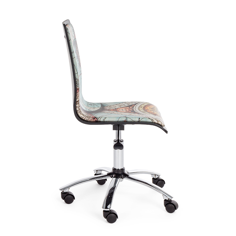 Bürostuhl aus Stahl mit Rollen und Sitz aus Kunstleder mit Kartendruck.