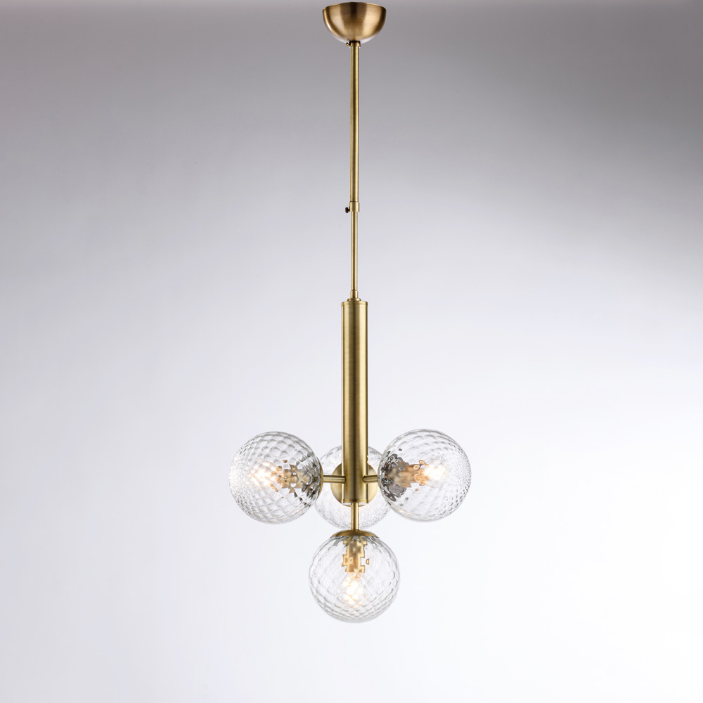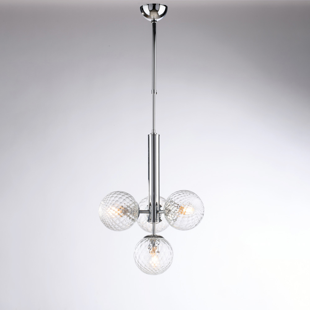 Diese elegante und moderne, handgefertigte Pendelleuchte aus Eisen besticht durch ihr ausgewogenes und raffiniertes Design. Die zentrale vertikale Struktur trägt vier kugelförmige Glasdiffusoren und erzeugt so eine harmonische Lichtkomposition, die das Licht gleichmäßig und angenehm verteilt.