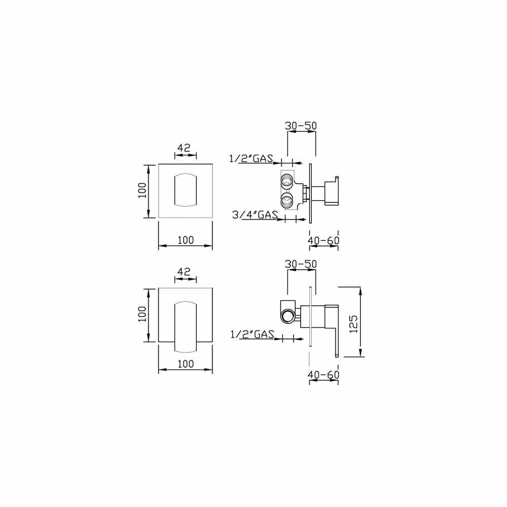 Brausemischer mit 5-Wege-Umsteller, komplett mit Unterputzteil und Außenteilen.
