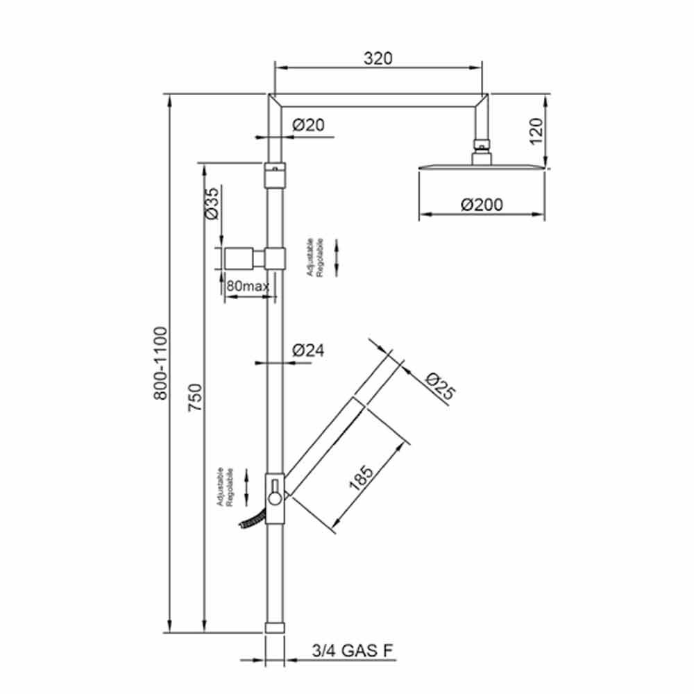 Duschsäule aus Messing, Stahl und ABS mit Gleithalterung, hochwertiges Produkt Made in Italy.