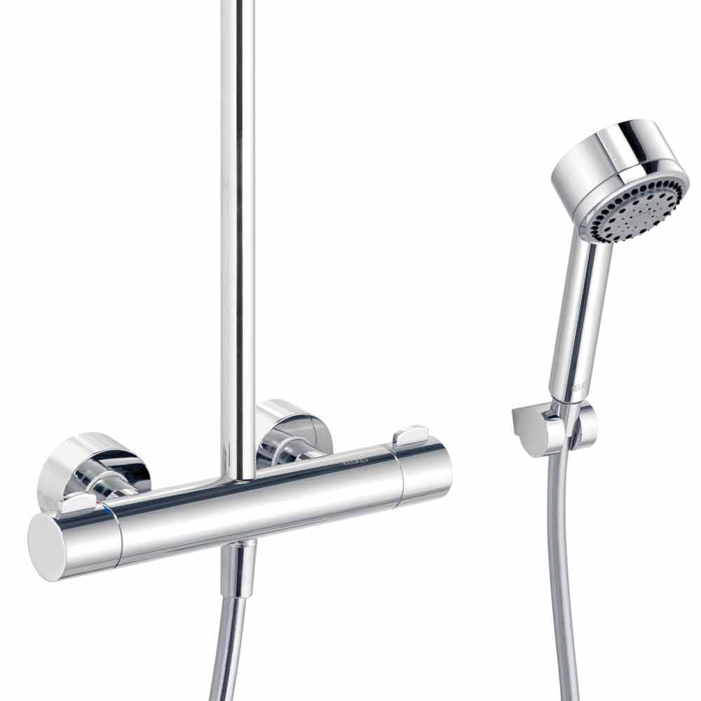 Brausebatterie komplett mit Kopfbrause aus verchromtem Messing gekennzeichnet durch das besondere moderne und praktisches Design.