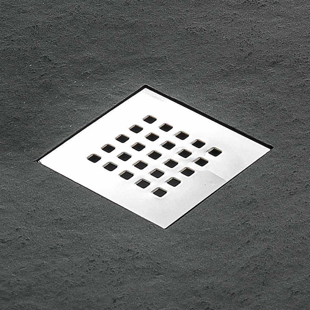 Moderne Duschwanne aus Harz mit Steineffekt und Stahlgitter.