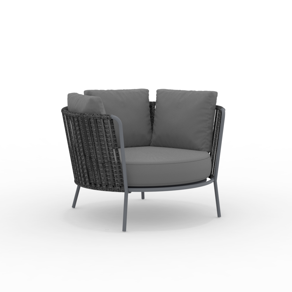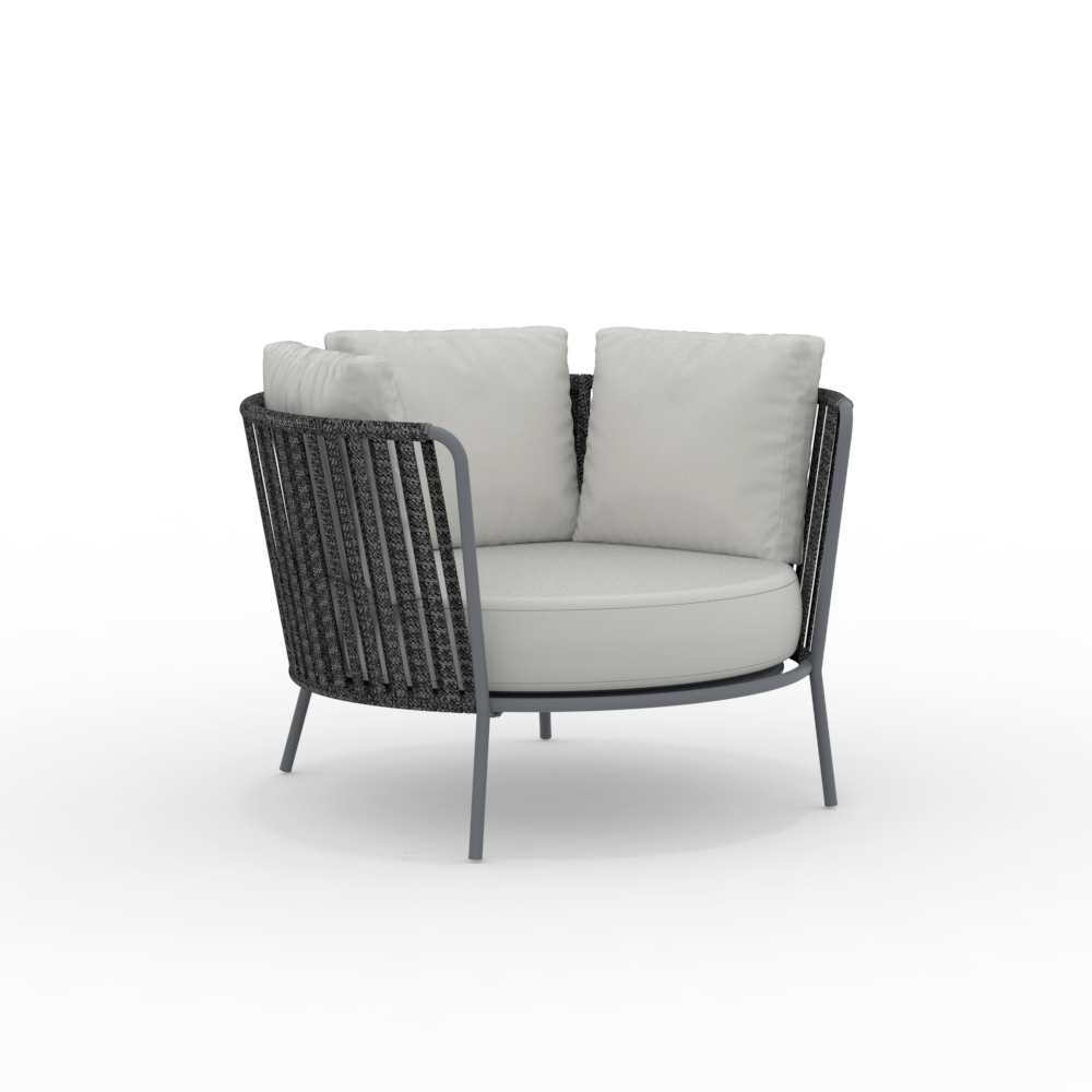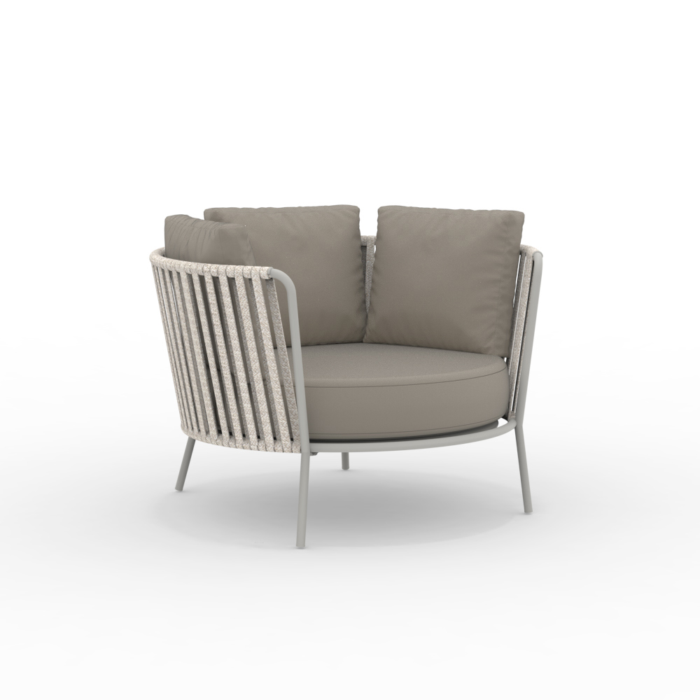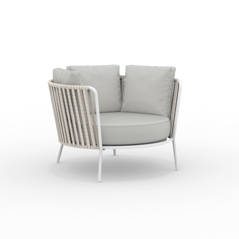 Die Edelstahlstruktur garantiert Stabilität und Witterungsbeständigkeit, während das Seilgeflecht Leichtigkeit und Eleganz verleiht und den Sitz wie eine bequeme Umarmung umhüllt. Das ergonomische Design und die abgerundeten Linien sorgen für ein angenehmes und entspannendes Sitzerlebnis.