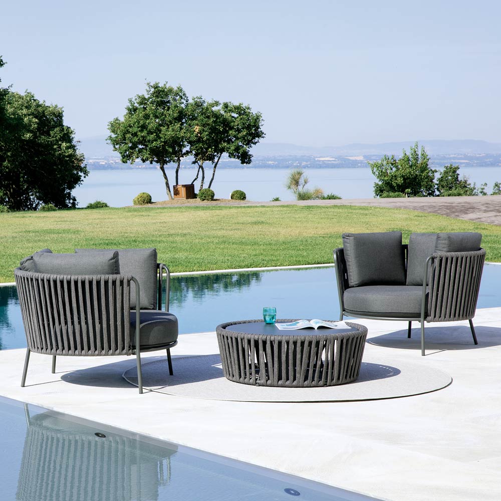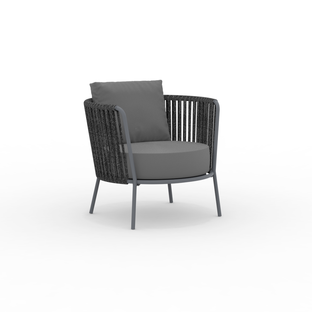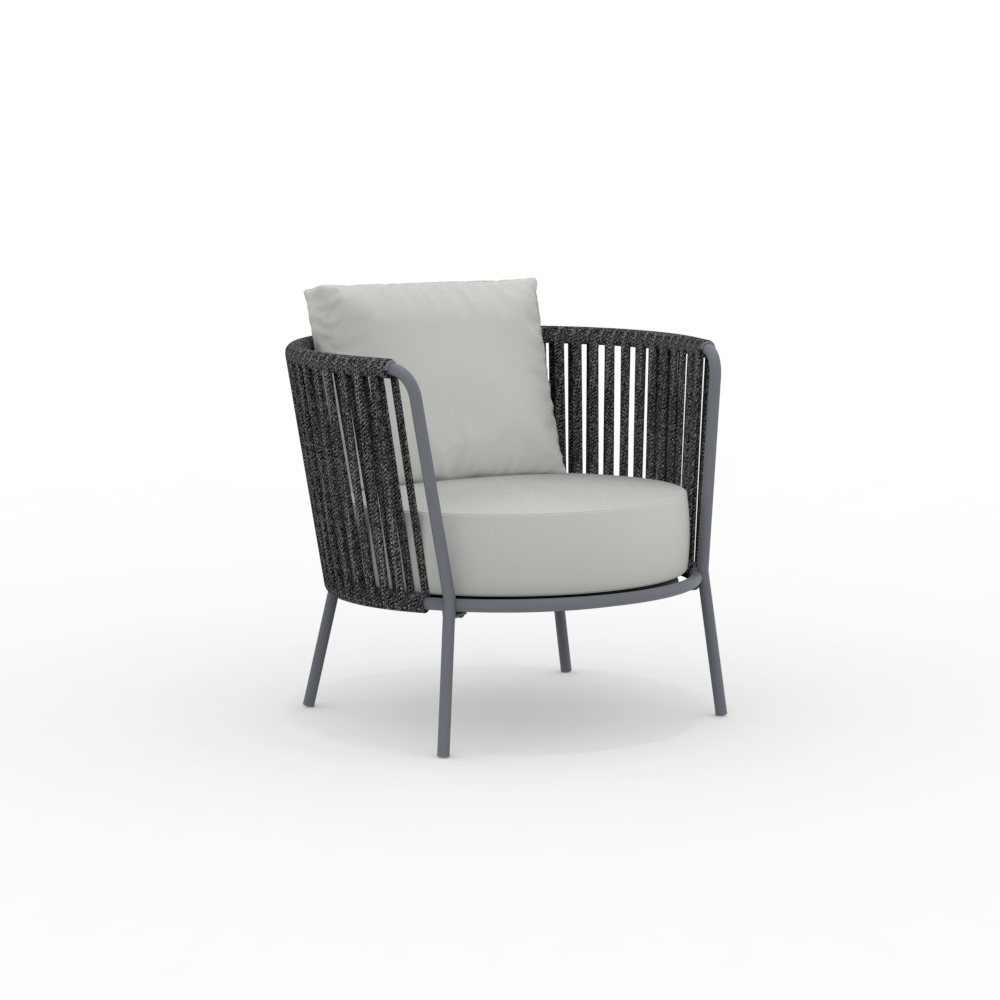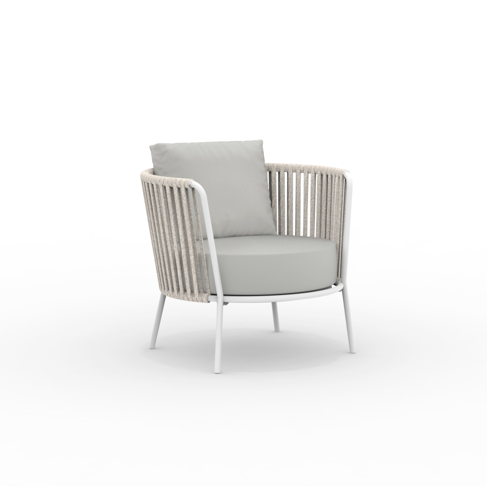 Die Edelstahlstruktur garantiert Stabilität und Witterungsbeständigkeit, während das Seilgeflecht Leichtigkeit und Eleganz verleiht und den Sitz wie eine bequeme Umarmung umhüllt. Das ergonomische Design und die abgerundeten Linien sorgen für ein angenehmes und entspannendes Sitzerlebnis.
