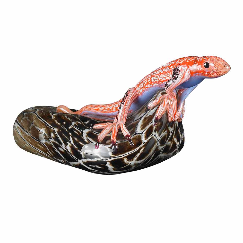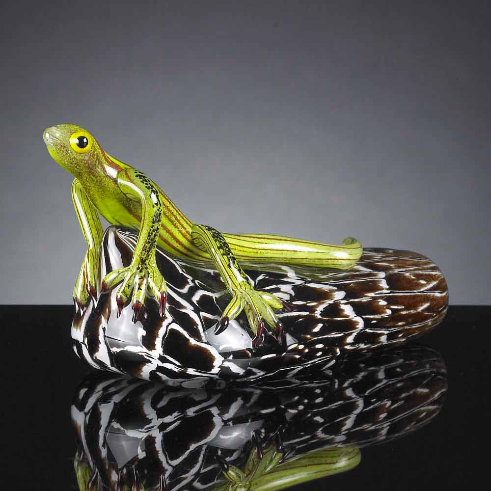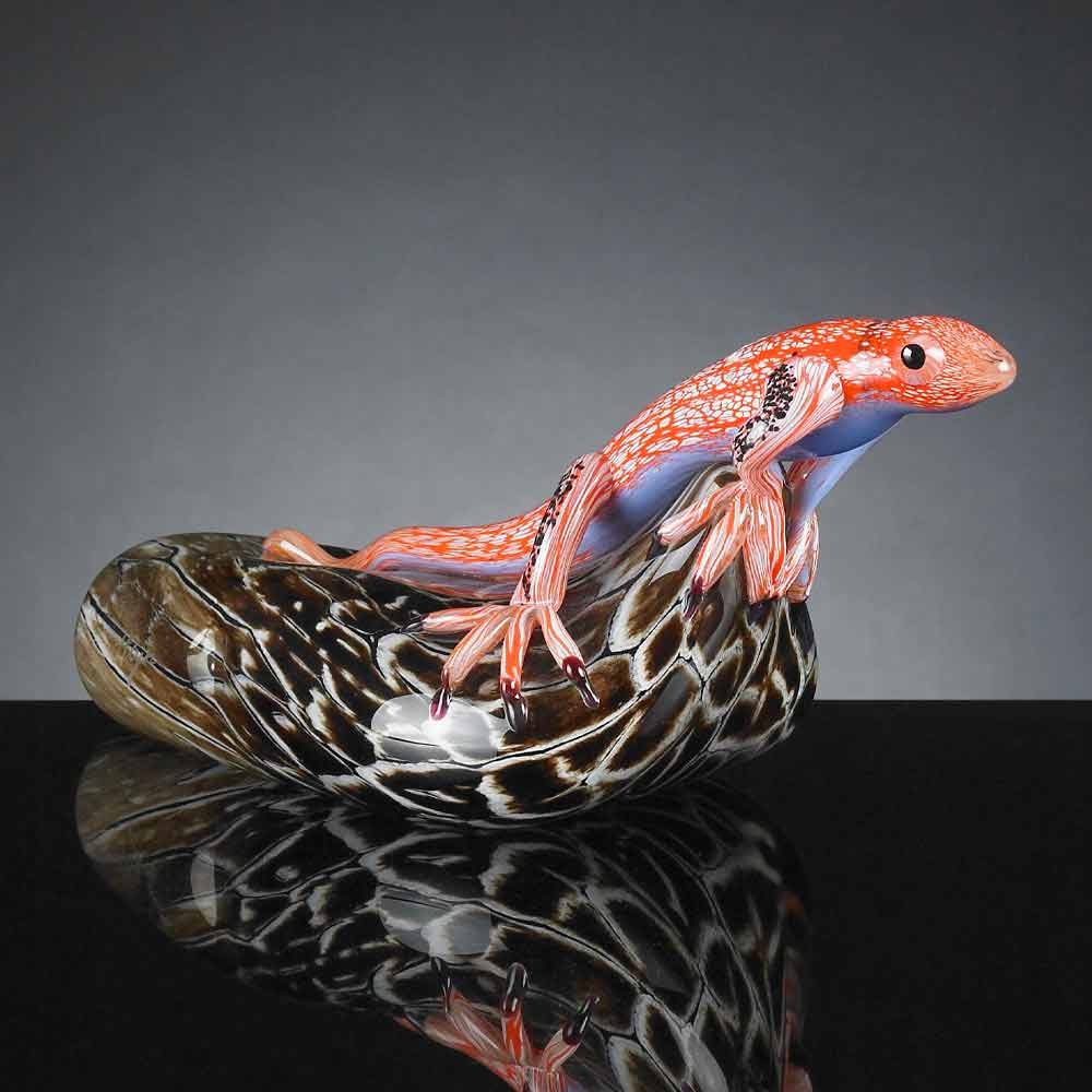 Ornament in Form einer Eidechse auf einem Stein aus farbigem Glas Made in Italy, fein.