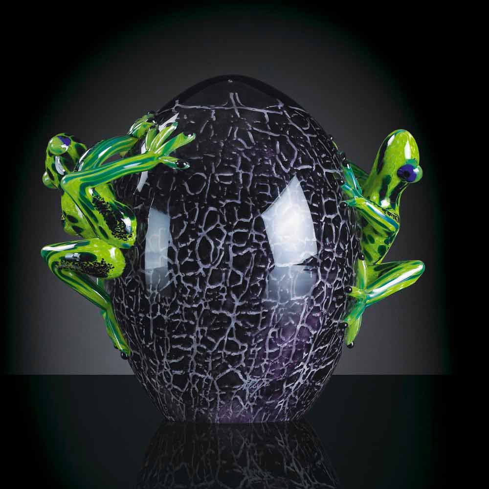 Dekorative Statue in Form von Fröschen auf einem Ei aus farbigem Glas Made in Italy.