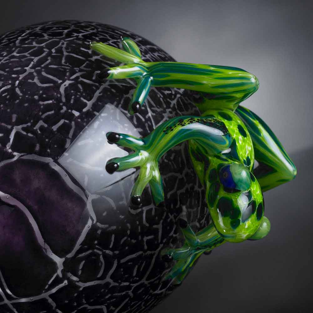 Dekorative Statue in Form von Fröschen auf einem Ei made in Italy aus schwarzem und grünem Glas . Ein Einrichtungsaccessoire mit intrinsischer Eleganz, das die zeitlose Raffinesse von Glas mit hellen und lebendigen Farben verbindet, die dem Produkt eine originelle Note verleihen und seine Wertigkeit und Wertigkeit unterstreichen. Die wundervollen Oberflächen und die neuen und kreativen Formen bereichern dieses Ornament und machen es zu einer perfekten Lösung für diejenigen, die einen kreativen und exzentrischen Stil für ihr Zuhause suchen, der eine exklusive Atmosphäre zum Leben erweckt.