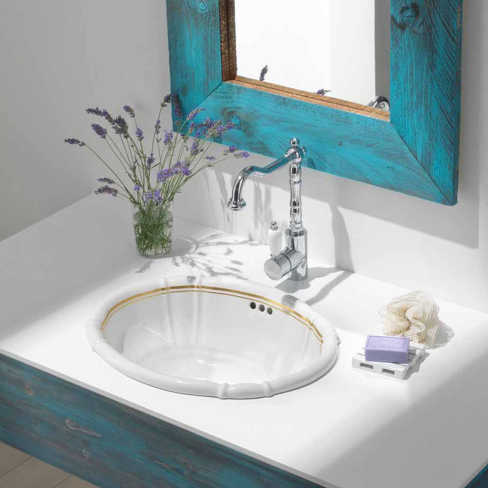 Einbauwaschbecken in Italien aus handbemalten Porzellan fein weiss mit doppelter Randlinie aus 24K Gold.