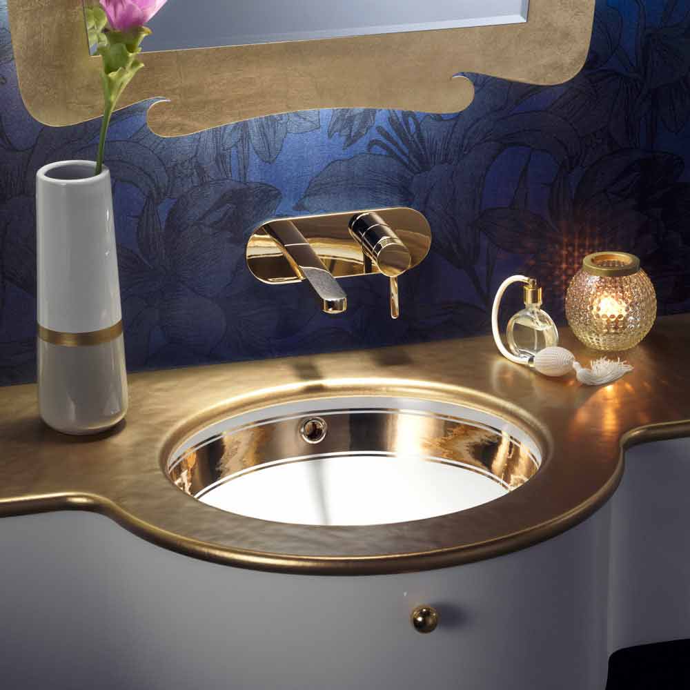 Einbauwaschbecken komplett in Italien realisiert handgefertigt aus Fire Clay mit Rand und Aufsatzrand aus 24 Karat Gold.