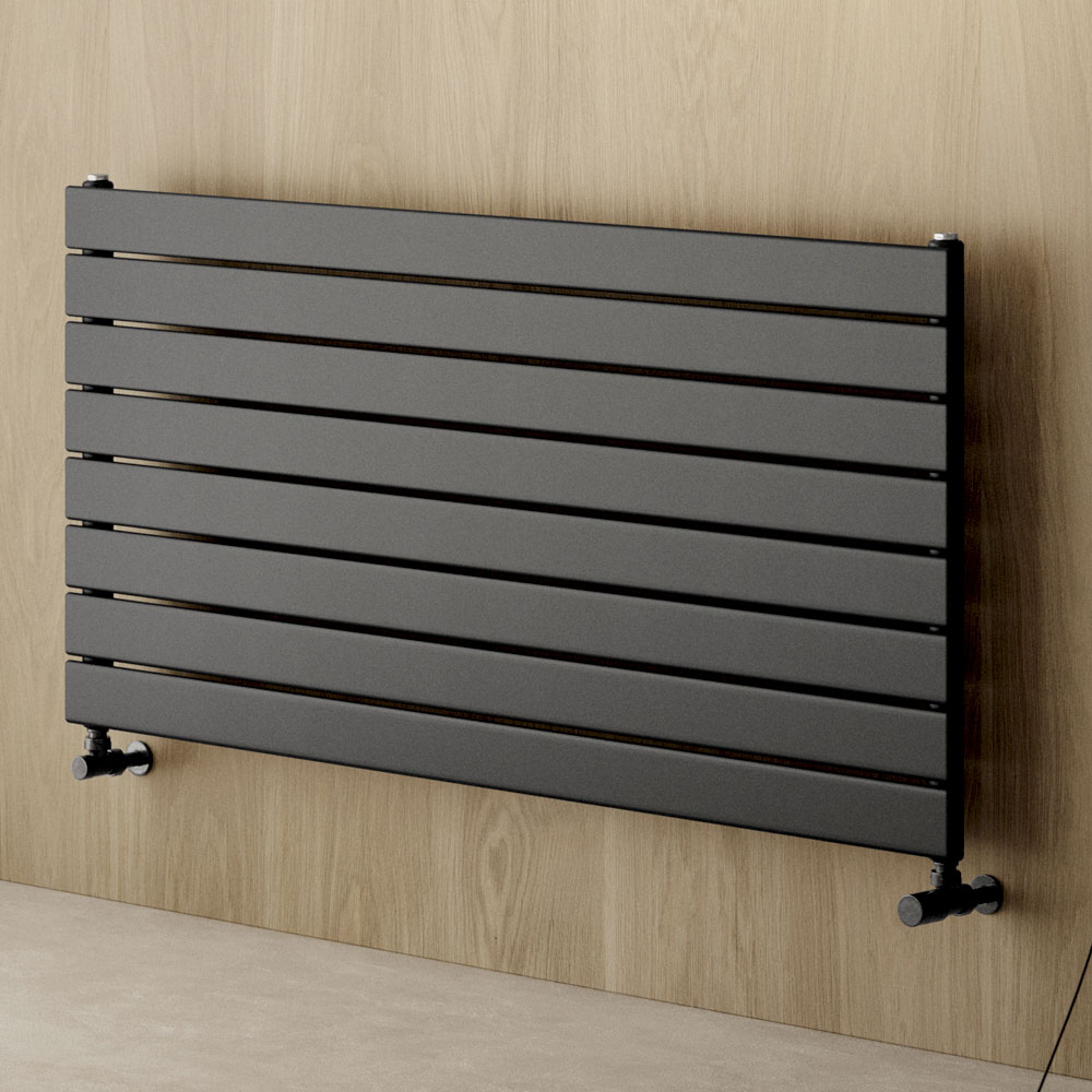 Hydraulischer Heizkörper aus Kohlenstoffstahl in mattschwarzer Ausführung mit horizontalen, überlappenden Elementen mit 70 mm Platte, komplett in Italien hergestellt.