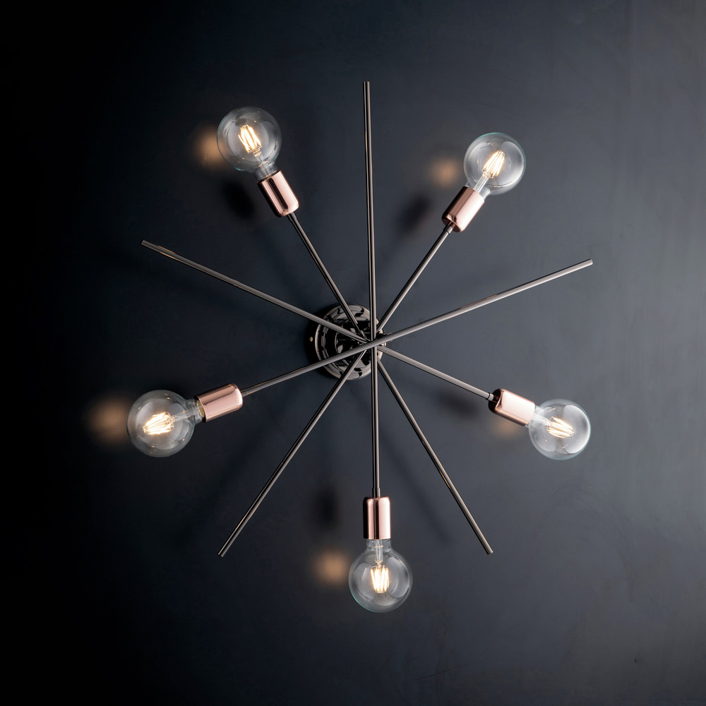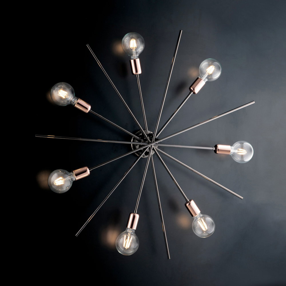 Diese handgefertigte Deckenleuchte aus schwarzem Chrom und Kupfer ist ein ikonisches und optisch beeindruckendes Meisterwerk moderner und anspruchsvoller Gestaltung. Die radiale Struktur, inspiriert vom Mid-Century- und zeitgenössischen Industriestil , entfaltet sich in einer dynamischen Komposition aus Metallarmen, die das Licht gleichmäßig und effektvoll streuen.