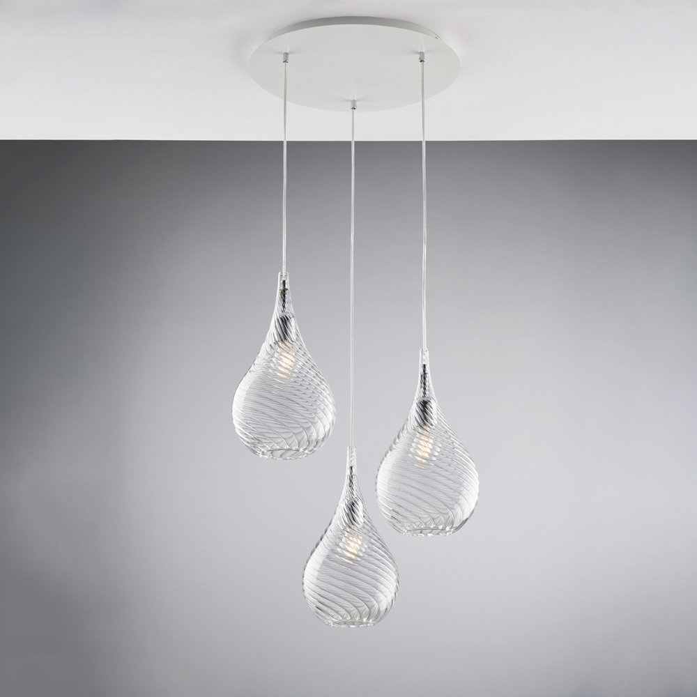 Diese elegante und leuchtende, handgefertigte Pendelleuchte aus Eisen mit Pyrex-Glas ist eine moderne und raffinierte Beleuchtungslösung. Die drei sanft geschwungenen Diffusoren aus Pyrex-Glas verteilen das Licht gleichmäßig und dezent und schaffen so eine einladende und zugleich elegante Atmosphäre.