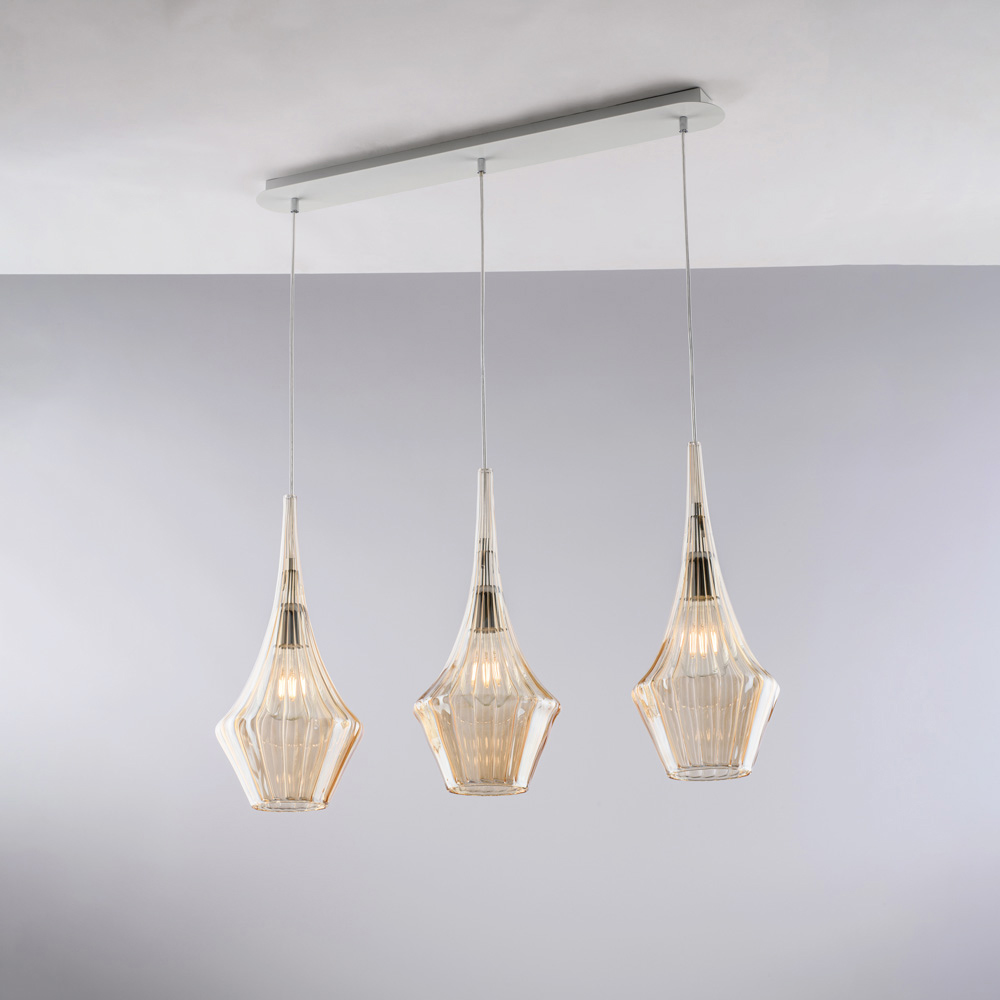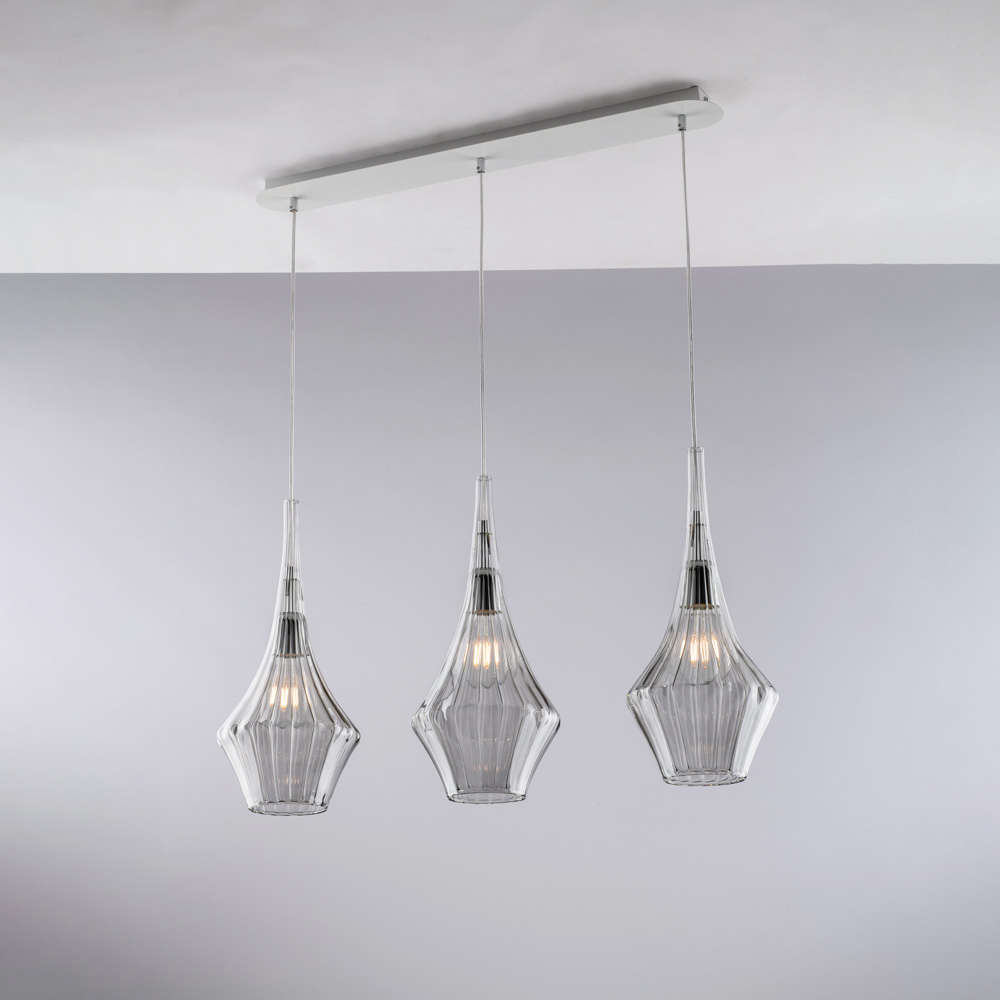 Diese handgefertigte Pendelleuchte aus Eisen mit Pyrex-Glas besticht durch ihr geradliniges und elegantes Design und ist eine moderne Beleuchtungslösung, die Räume harmonisch und stilvoll aufwertet. Die drei Pyrex-Glasdiffusoren mit ihren facettierten und harmonischen Formen verteilen das Licht gleichmäßig und schaffen so eine helle und elegante Atmosphäre.