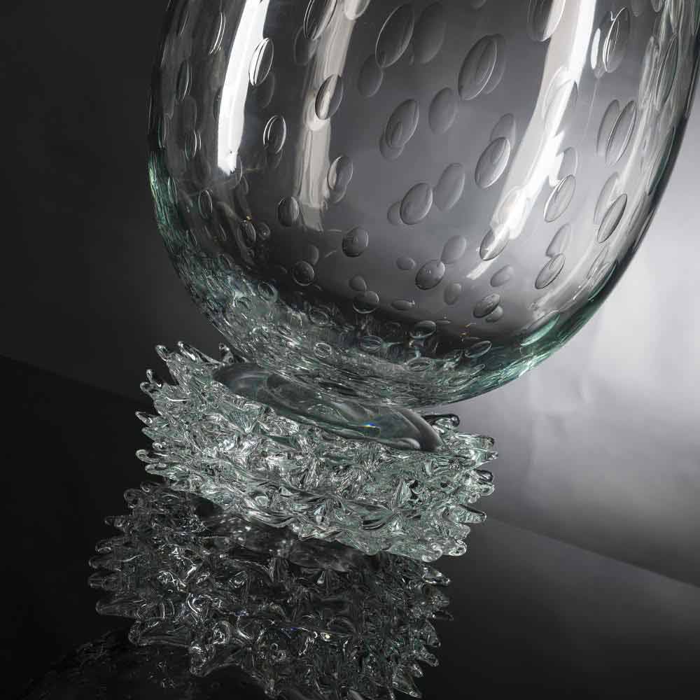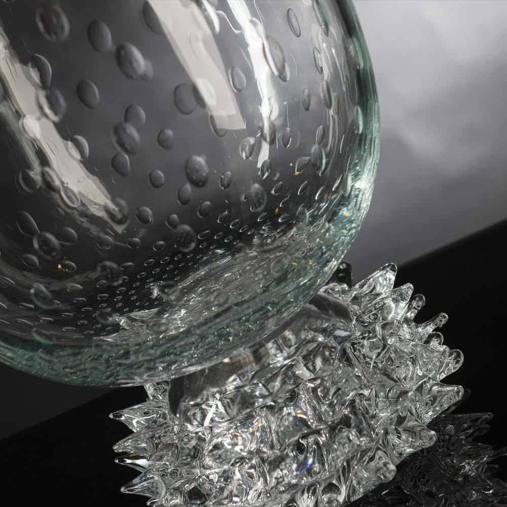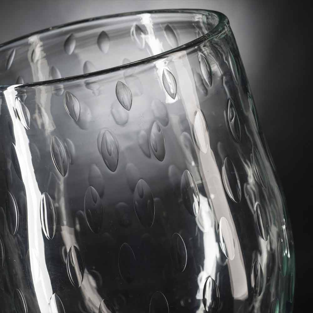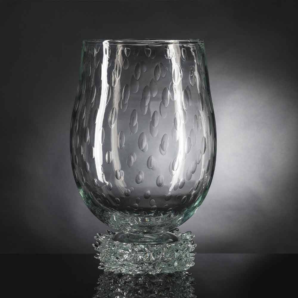 Ziervase für den Innenbereich, vollständig in Italien hergestellt aus transparentem mundgeblasenem Muranoglas mit bearbeitetem Boden. Eine Ergänzung, die sich durch eine äußerst elegante Ästhetik auszeichnet, ideal für stilistische Situationen mit einer edlen Einrichtung, in der eine perfekte Harmonie dank sich ergänzender Objekte für eine einzigartige und aufsehenerregende Atmosphäre geschaffen wird . Die Stärke dieser Vase ist die besondere Textur, die die gesamte Struktur bedeckt, zusammen mit den wunderbar gearbeiteten Details am Sockel, Elemente, die ihren raffinierten Stil für ein exklusives Ergebnis mit starker visueller Wirkung unterstreichen. Ein ideales Design für die unterschiedlichsten Umgebungen, von der Wohnungseinrichtung bis hin zu Hotels, Restaurants, Objektbereichen, Spas, aber auch als Rahmen für Veranstaltungen und Hochzeiten.