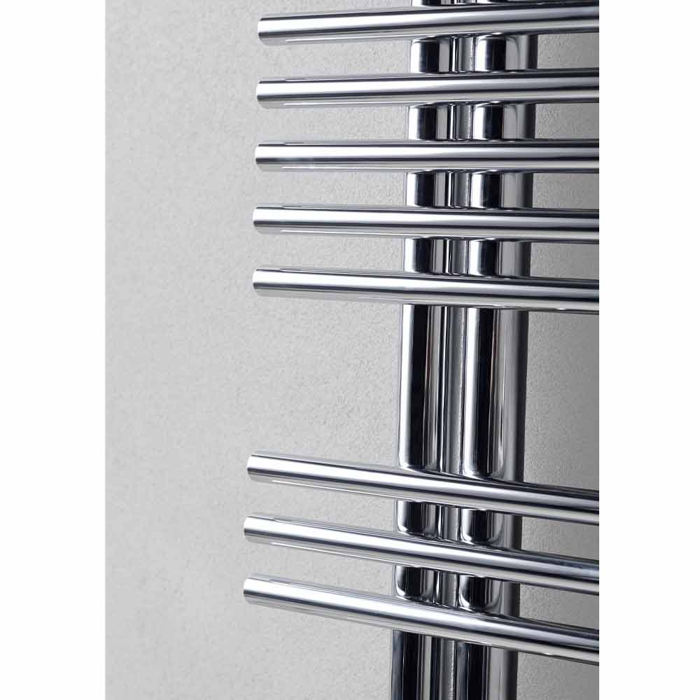 Dieser elektrische Handtuchwärmer verfügt über ein Chromdesign aus vertikalen Rohren mit 35 mm Durchmesser und horizontalen runden Rohren mit 25 mm Durchmesser. Seine moderne und besondere Form macht es ideal für die Dekoration der neuesten Badezimmer mit einem Hauch von Originalität.
