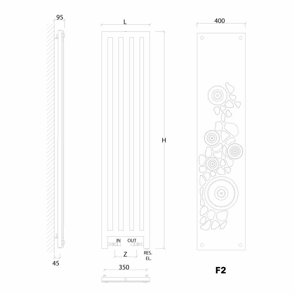 Maße L.400 mm, H.1800 mm, P.85 mm, Achsabstand 172 mm, elektrischer Widerstand 600 Watt, Kapazität 10,2 l, Gewicht 29,5 kg
