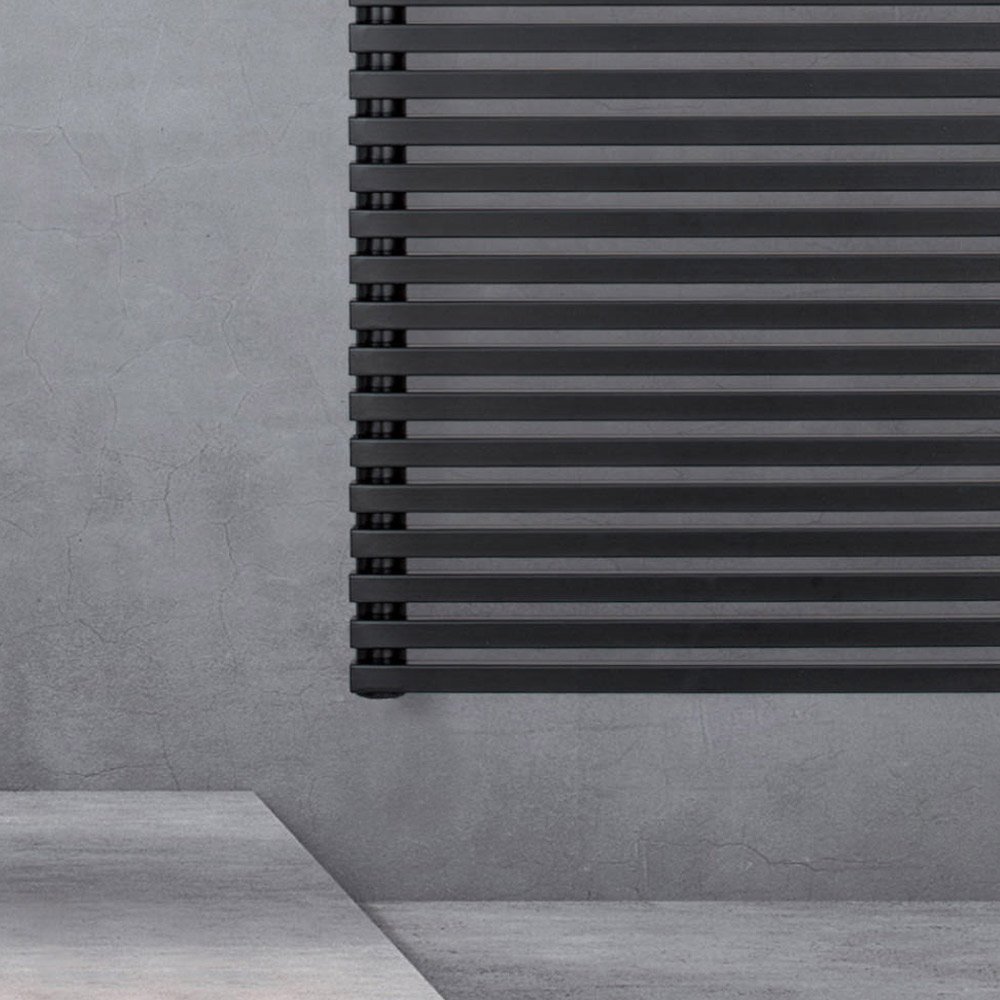 Elektrischer Handtuchwärmer aus Kohlenstoffstahl mit tiefschwarzer Oberfläche, bestehend aus einer Reihe horizontaler Elemente mit einem quadratischen Querschnitt von 2 cm, die an vertikale Verteiler mit einem Durchmesser von 3,5 cm geschweißt sind, vollständig in Italien hergestellt, inklusive Wandbefestigungsset . Elektrifizierungssatz unten rechts positioniert.